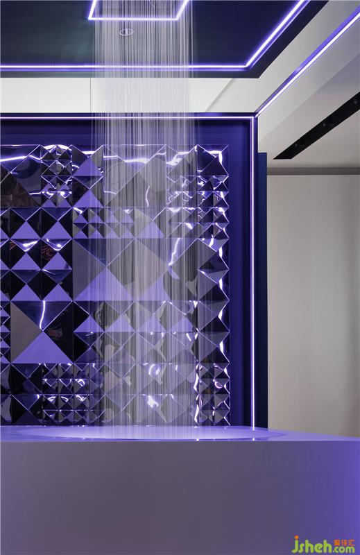 雨沐在燈光和菱形鏡面不銹鋼的映襯下