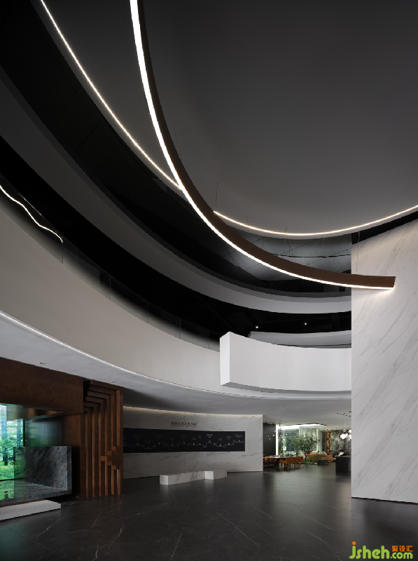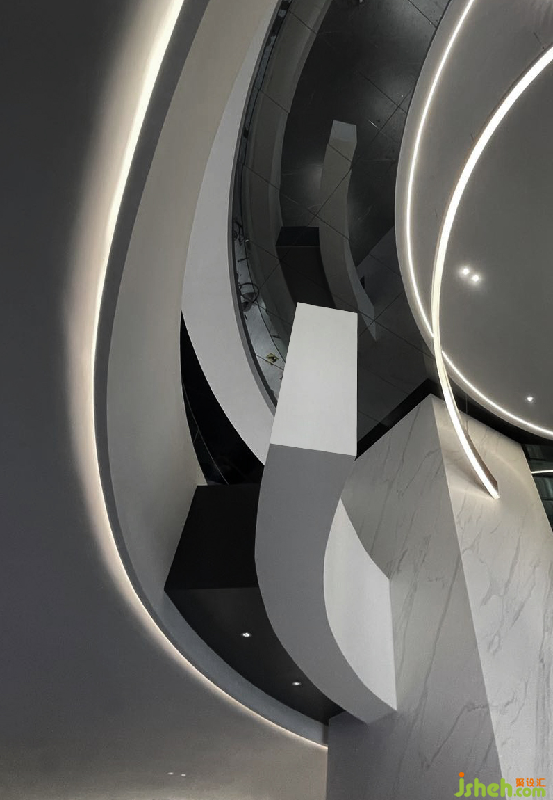 大堂的圓形中空除具有建筑幾何美感,也隱含了東方哲學(xué)觀念的“天圓地方 ”,更表達(dá)出一種星球運(yùn)動(dòng)的軌跡。環(huán)繞線條元素在三維空間里按照美的視覺效果、力學(xué)的原理進(jìn)行編排和組合,營(yíng)造出“別有洞天“的空間感受。