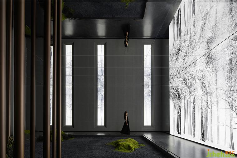 穿過大堂盡頭,恍若進(jìn)入一片森林秘境,無限的延展與放飛想象,讓身心合一,感受心靈與自然親密接觸。瓷磚總部設(shè)計師在這里用虛實(shí)相加的手法營造了一片森林秘境,用粗細(xì)不同的不銹鋼圓柱做成叢林,在叢林中設(shè)置造霧器使云霧彌漫開來,和虛擬的霧凇林相互映襯,穿過叢林的一條U形棧道增加了進(jìn)入該空間的儀式感,