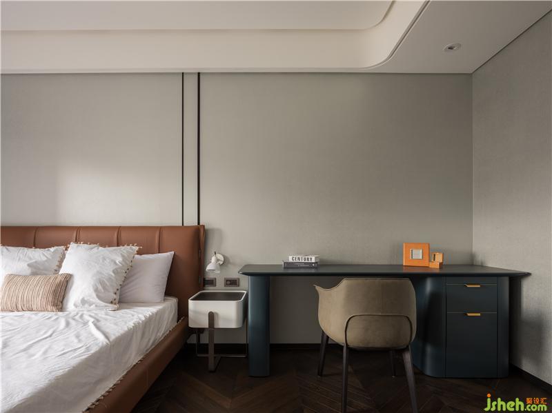 馬鞍皮與車(chē)縫線演繹著雋永的訂制感,平添一種奢華簡(jiǎn)約,處處顯露著材質(zhì)混搭的精工。每一個(gè)縫線和皮料都經(jīng)過(guò)時(shí)光的工法有所呈現(xiàn),有柔有剛的壓條與皮革優(yōu)雅體現(xiàn)在細(xì)致的線條與細(xì)節(jié)上。臥室空間,床頭柜墻的另一側(cè)被設(shè)計(jì)為為書(shū)房空間,讓其具有足夠的開(kāi)放性,即能滿足閱讀功能。融合了展示格、書(shū)籍收納層架以及抽屜,并加入亮橘點(diǎn)綴,營(yíng)造視覺(jué)的驚喜和動(dòng)感。