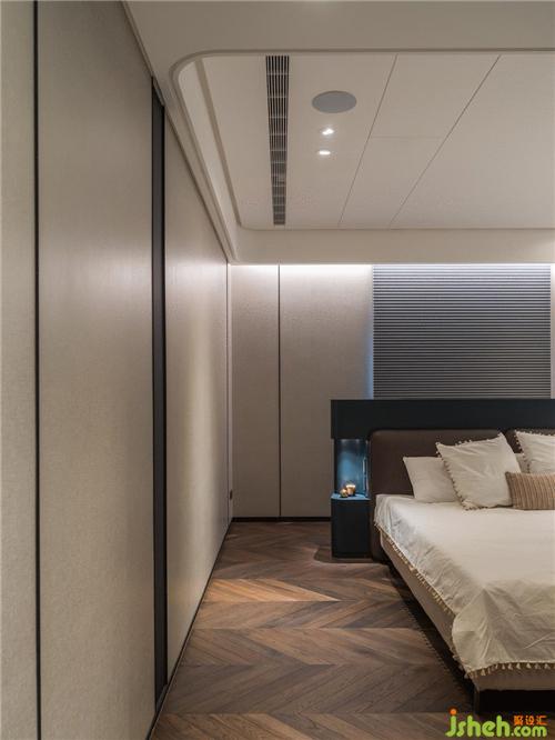 人字拼接不同顏色的深淺,增加了空間的動(dòng)感,另外各種家具天花和曲線的結(jié)合,也寓有著別樣的氣質(zhì)。不規(guī)則曲線的半腰床頭板墻,將睡眠區(qū)與閱讀區(qū)分隔出來(lái),引窗外天光至此,善利用轉(zhuǎn)角處創(chuàng)造床頭光。以圓曲線造型規(guī)劃出衣柜,曲直互補(bǔ)增加了臥室柔和,空間流動(dòng)互相呼應(yīng)。