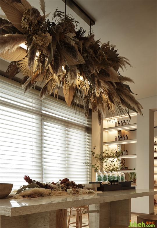多種木質(zhì)的混合,結(jié)合在室內(nèi)裝置上添加的頂棚吊花,也強(qiáng)調(diào)了整體空間的草木質(zhì)感。藍(lán)城花海芳香小鎮(zhèn)會(huì)所設(shè)計(jì)家具選型又以手工藝術(shù)風(fēng)格制品為主,強(qiáng)化了這種的氛圍感受。