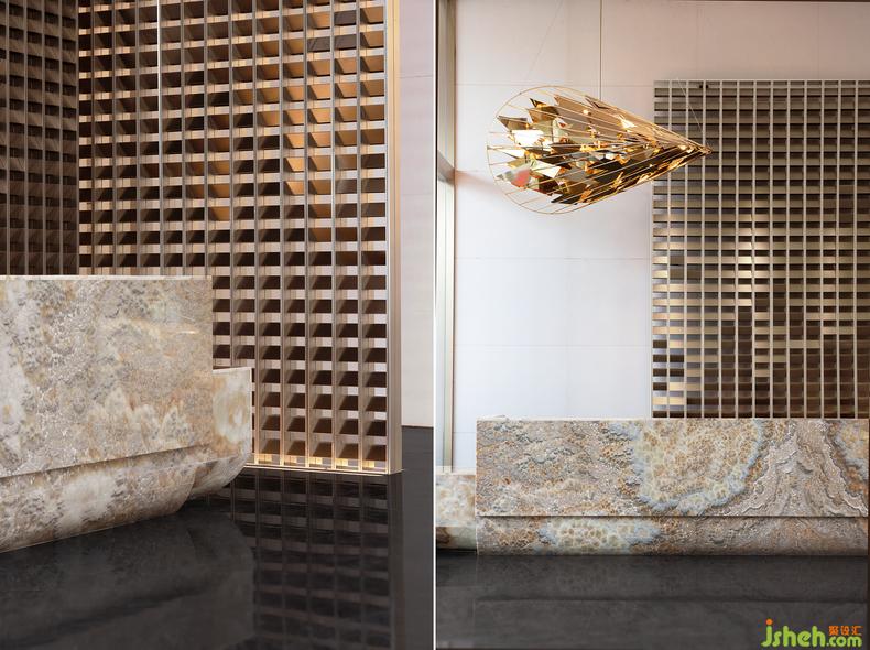 移步往前,由紅色金屬簾幕圍墜起的沙盤區(qū)域恰似長河落日籠罩的幽谷,生活館設計展示著專屬這片土地的壯麗。金屬簾幕從天花墜下,其材質透光特性帶來的通透感讓人在其中更感靈動,而紅色主題又蕩漾出一種少女舞姬那翩躚紅裙與曖昧面紗的風情萬種。簾幕中還間雜著幾盞煙花般綻放的吊燈,讓人如見落日、如遇星光,胸中更生無限瑰麗的遐想。