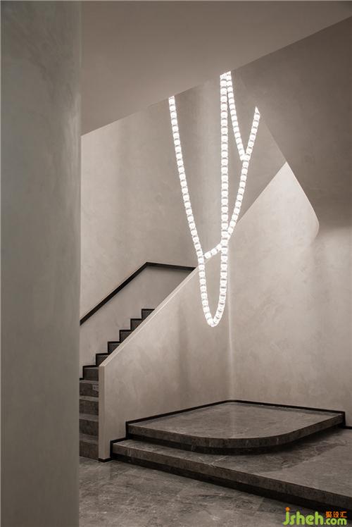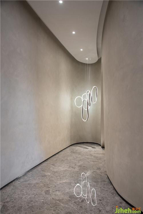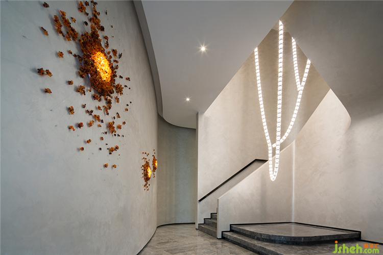 WJID提取硬裝空間的形態(tài)元素,在藝術(shù)長(zhǎng)廊盡頭形成垂掛式的藝術(shù)裝置,迎著光與花蜿蜒在墻面,如同城市線條的縮影。