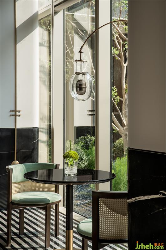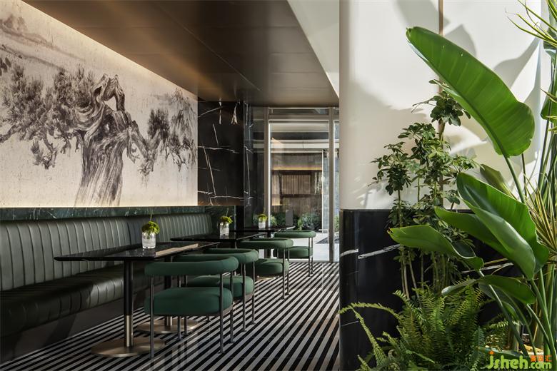 變化的光線天然調(diào)節(jié)室內(nèi)光線,落地窗成為富有韻律的畫(huà)框,座椅融于環(huán)境。東方意境的畫(huà)作于墻面延伸,成為空間“松月”意境的引申。柔軟的織物包裹著硬朗的形體,座椅本身就是“松”形態(tài)的寫(xiě)就,與海派風(fēng)光融合,餐食環(huán)境不拘一格。