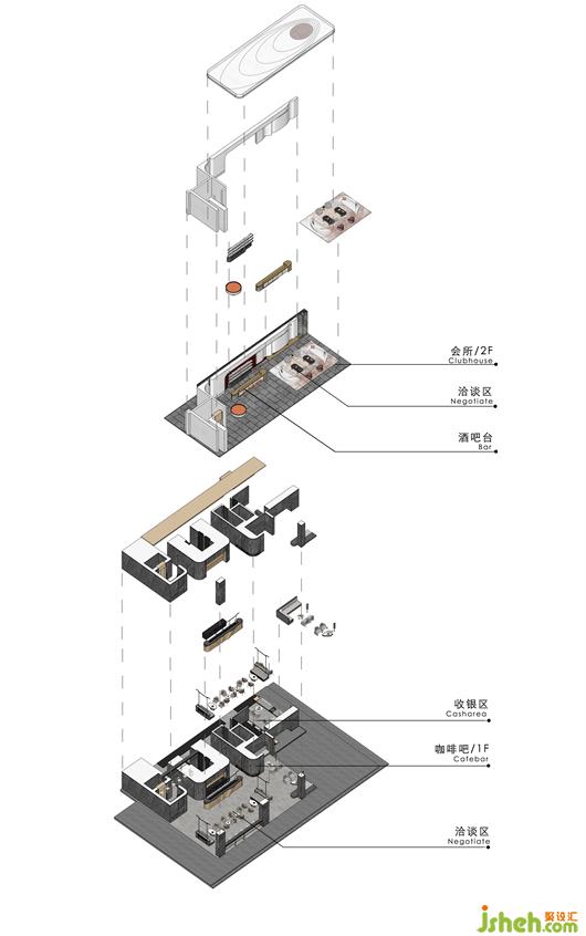 設(shè)計(jì)師希望在街區(qū)式的體驗(yàn)空間為都市休閑生活找到靈魂歸屬,一層為咖啡吧,二層為帶有酒吧功能的會(huì)所。暢快、恣意的工業(yè)風(fēng)被融入其中,意圖呈現(xiàn)放松感,以溫柔的月光色譜出光的曼妙旋律。