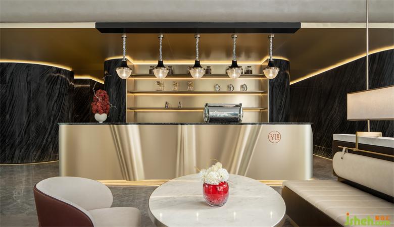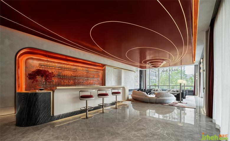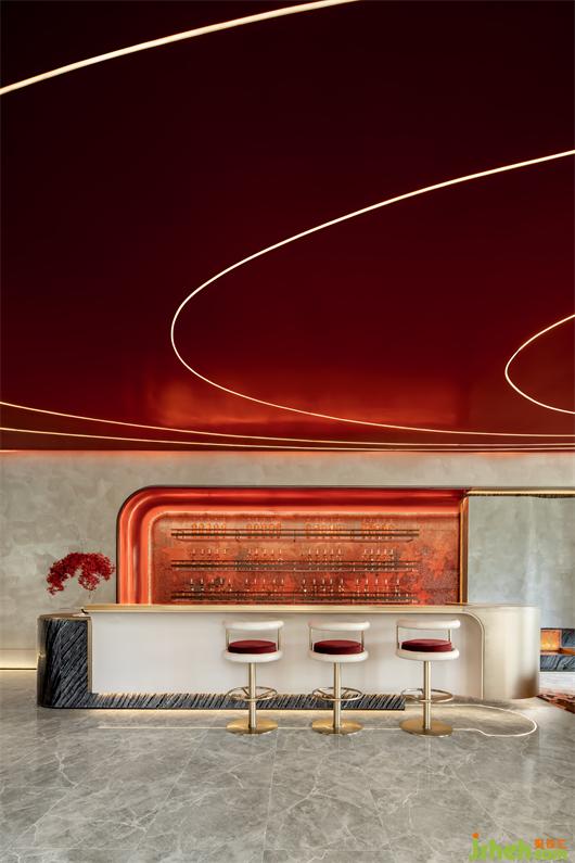 橙色透過暖黃燈帶聚焦空間的高光色,落在水吧區(qū)。熱情洋溢的情緒色彩噴薄而出,顯示奢貴的都市氣息。沙發(fā)椅勾勒對話的美好弧度,構筑出更為皎潔的對話場景。