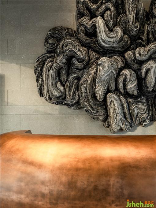 前廳的接待處如同一個金色大缽,包容萬境,墻面的粗曠質(zhì)地帶來亙古原始質(zhì)感,紙線裝置融入其中體現(xiàn)東方設(shè)計特有的禪境。