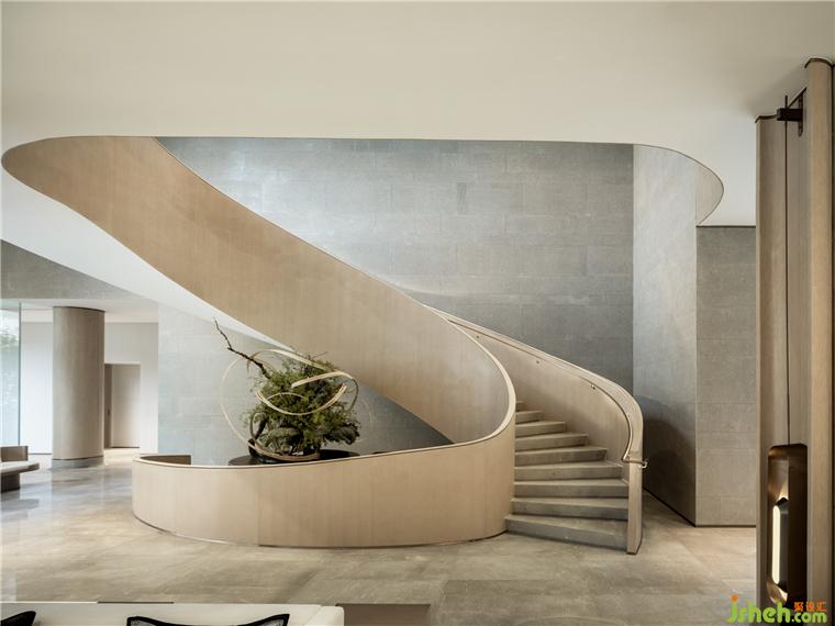 樓梯的月白之光因形體散發(fā)浪漫的質(zhì)感,營銷中心設(shè)計與金色扶手相映交織,融景于境,帶來不同視角的多重觀賞。