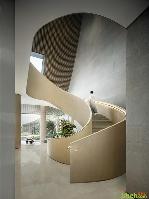 旋轉(zhuǎn)樓梯旁的花藝裝置運(yùn)用“夢(mèng)筆生花”的典故。營(yíng)銷中心設(shè)計(jì)通過花藝裝置的形,木與藤條的交織,重構(gòu)東方寫意魂曲。