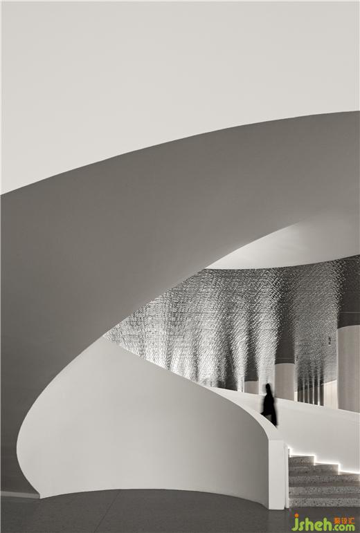 弧形旋轉(zhuǎn)樓梯如同雕塑,覆以白色藝術(shù)涂料,公共藝術(shù)中心設(shè)計(jì)勾勒出空間深度也劃分空間功能。