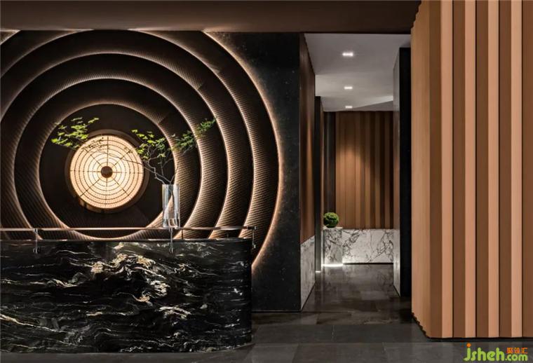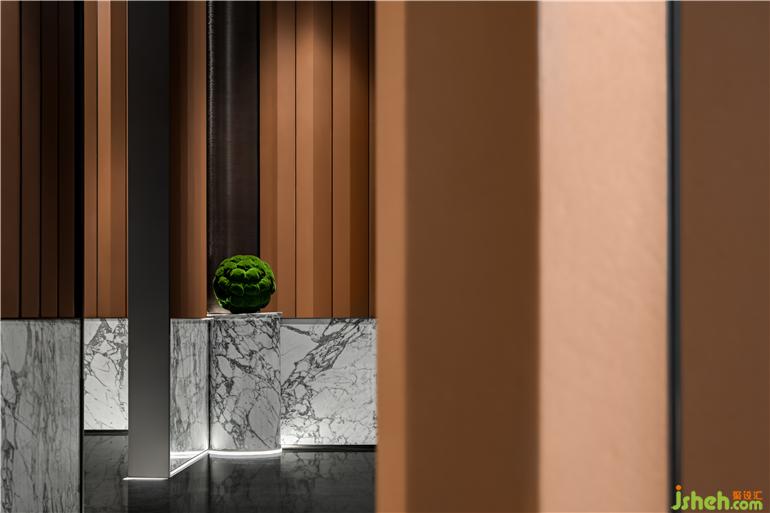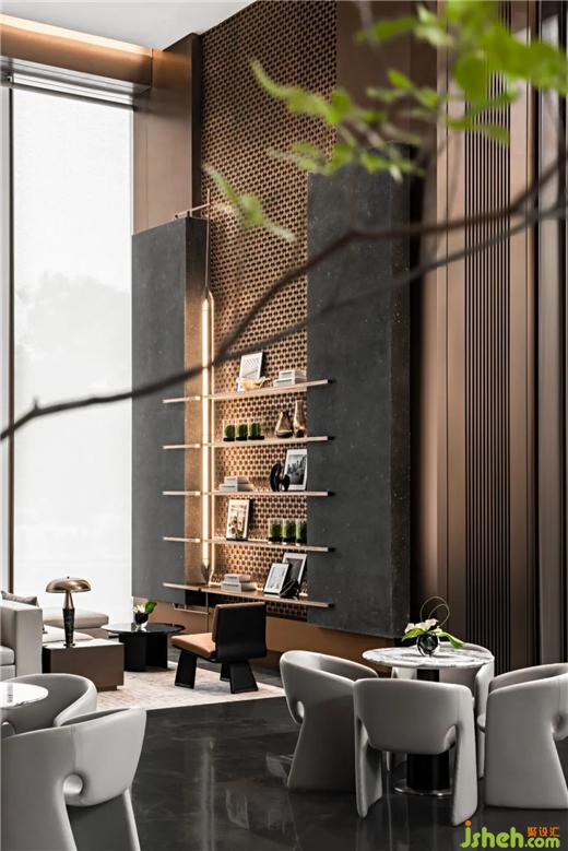 地毯寓意為海洋,蜂巢金屬背景墻折射光線投映到室內(nèi),大氣穩(wěn)重的基調(diào)下又充滿時尚感,木飾面鋪陳敘事,大理石材不同肌理的表達,強調(diào)空間的韻律美與秩序感,成都龍湖瑰云里營銷中心設計空間之間靜默存在又彼此串聯(lián)。