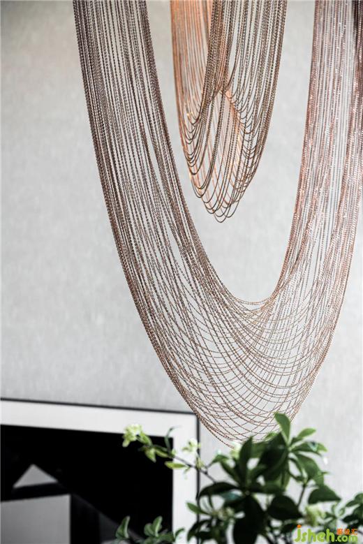 挑高的落地窗,猶如巨幅畫框,成都龍湖瑰云里營銷中心設(shè)計將窗外的視野納入室內(nèi),名為Otéro(奧特羅)的銅鏈?zhǔn)止舭摑櫆嘏挠行螣o形,如珠寶墜于美人脖頸,視線過渡到深木色長桌及淺色皮制座椅,桌面自然花藝調(diào)和色調(diào),跳躍其間,整體調(diào)性與自然和諧相成,趣味橫生。