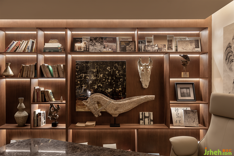 步入靜謐的書房,展示柜上陳列著居者的藝術(shù)藏品,一方書桌承載起生活的氣息,復(fù)古風(fēng)格的金屬臺(tái)燈,映襯著棕色花紋的大理石臺(tái)面,柔和的線條,溫潤(rùn)的色調(diào),終覺內(nèi)心寧?kù)o。