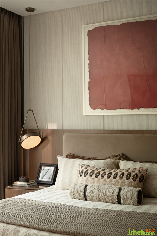 次臥延續(xù)了暖棕色調(diào)的氛圍,詮釋內(nèi)心的靜謐,紅棕色的藝術(shù)畫作為一抹點睛,樣板房設(shè)計賦予了空間溫暖的氣息,窗外的喧囂被巧妙地隔絕,時光的質(zhì)感在這里變得生動而具象,仿佛可以觸摸,可以感受,讓人沉醉其中,忘卻外界的紛擾。