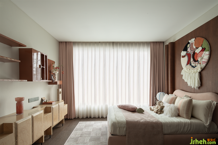 女孩房以夢幻的粉色為主色調(diào),在床頭背景處打造出立體帷幔的藝術(shù)裝置,如同一幅畫卷徐徐展開,搭配編織藝術(shù)掛毯,賦予空間無盡的想象力和藝術(shù)感。