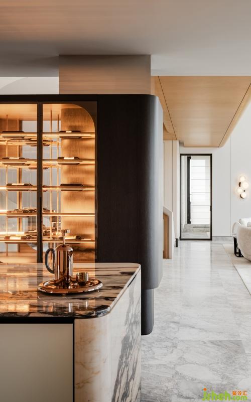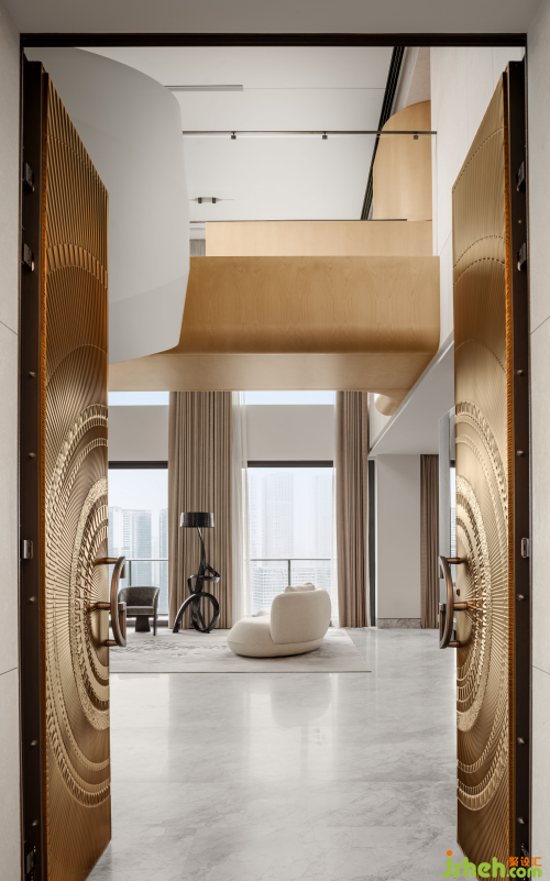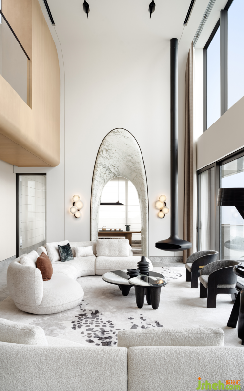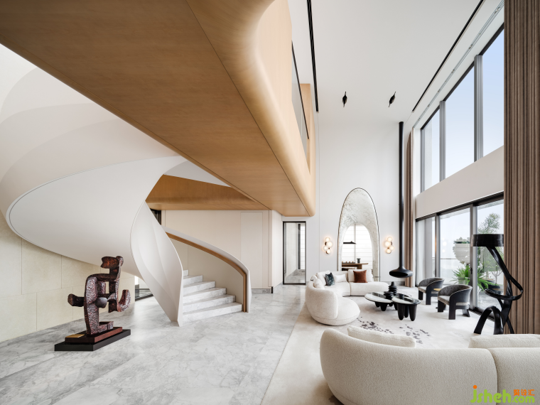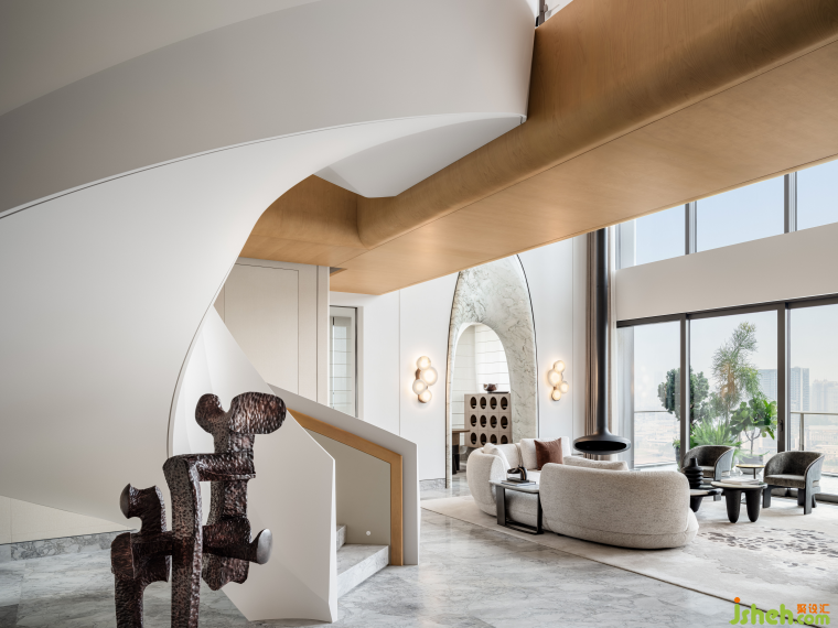 由WJID 傾力打造的頂層復(fù)式居住空間,以靜奢主義的設(shè)計手法,塑造自然與文化交融的空間底蘊,于天際之上啟幕奢闊的生活場景,將無限江景與城市精英生活相融合,演繹城市半島的理想棲居之境。
