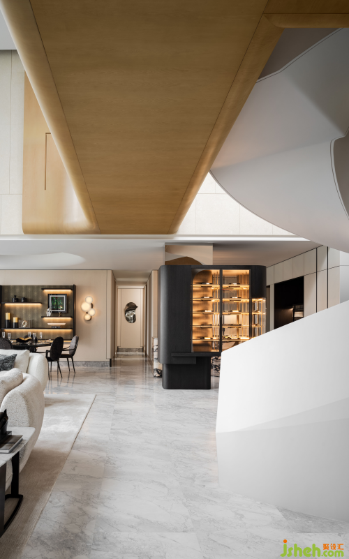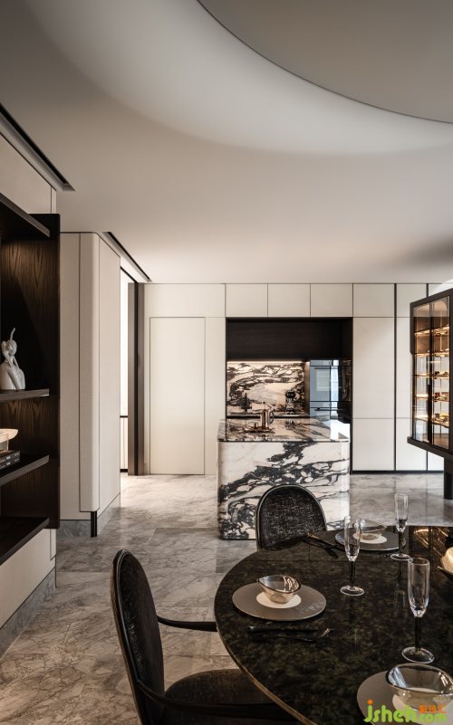 餐廳區(qū)域,位于客廳一側(cè),以開放式布局與客廳自然銜接,既保持了空間的通透感,又賦予了用餐時光更多的情感交流空間。餐桌旁搭配墨綠色暗紋的開放式陳列柜,展示了居者的精致收藏品。半月造型的頂部天花板設(shè)計,更營造自然與靈動的氛圍。