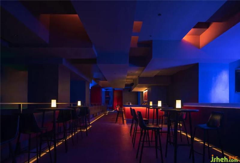 在對(duì)梁體和管道進(jìn)行包覆之后,就自然形成了層層疊疊的體塊關(guān)系。凹洞內(nèi),加入彩色的燈光酒吧裝修設(shè)計(jì),形成迷幻的“天窗”效果。