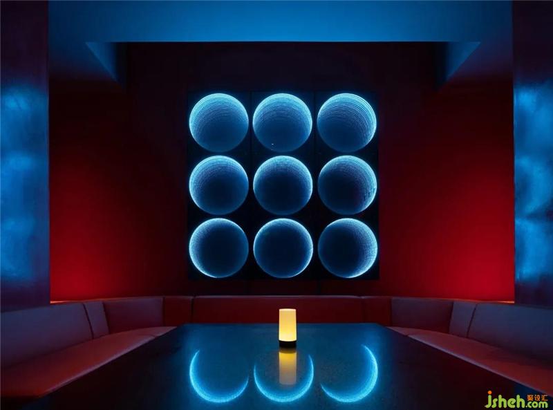 We use this kind of block relationship and layering in the overall space design,such as deliberately lengthening the span of the bar to highlight its core role;for example,the logo wall of the back bar uses array type luminous acrylic combination to enhance the visual impression of consumers.