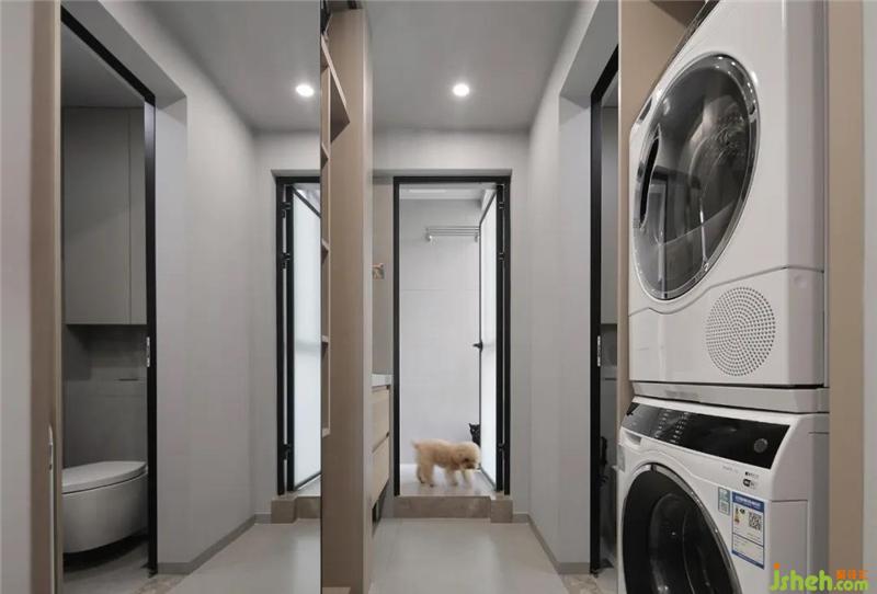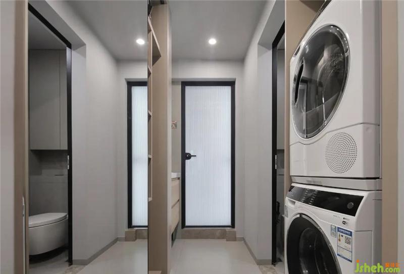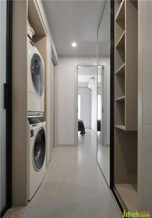 家政間的設(shè)計(jì)是第三處空間魔法。利用生活陽臺(tái)、客衛(wèi)和走廊,打造了三分離衛(wèi)生間、洗衣機(jī)區(qū)、次凈衣區(qū)、衣帽柜和梳妝柜,集大成于家政空間,極大提升了生活效率。