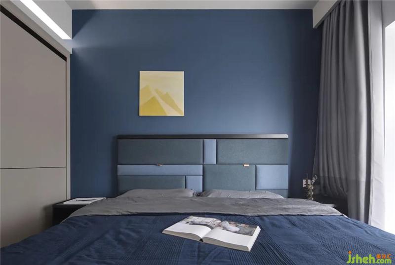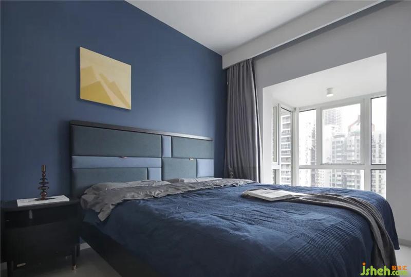 公共區(qū)域的用途已經(jīng)足夠豐富,所以主臥只保留了最基本的功能。公寓裝修設(shè)計(jì)墻上裝飾畫出自公司小伙伴之手,藏藍(lán)色的墻面上似乎多了一處透氣的窗口——窗外有山,心里有景。
