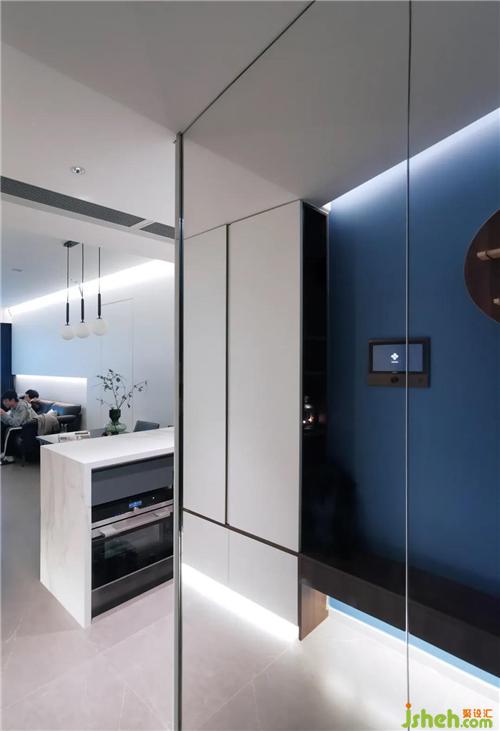 玄關(guān)之內(nèi),一墻銀鏡,反射出雙倍的線性光。裝修設(shè)計(jì)復(fù)行十步,豁然開朗,這是生活的明度。