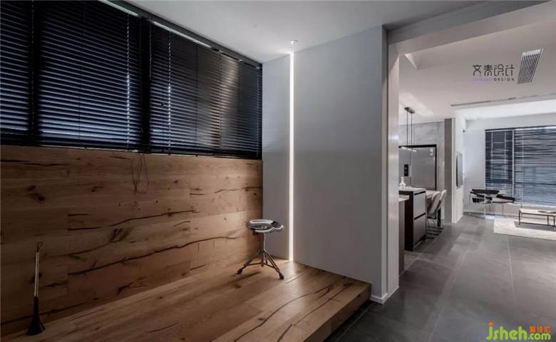 進(jìn)門本來是入戶花園,后期內(nèi)包成室內(nèi)的一部分,地板上墻還做了地臺(tái)。這是主人進(jìn)戶,換鞋、整理的過渡區(qū)域。