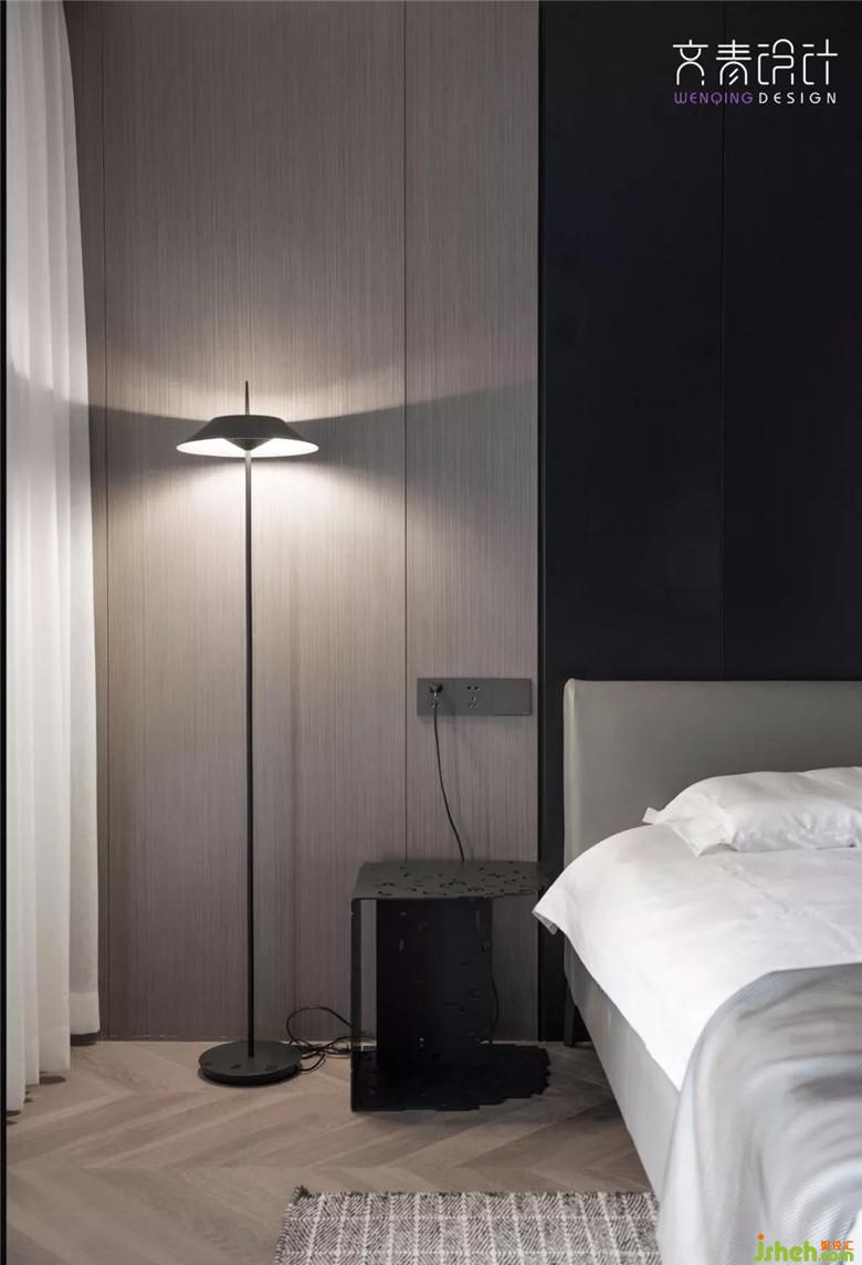 落地?zé)艉痛差^純黑鏤空金屬床頭柜,木飾面用的也是比較經(jīng)典的色系。