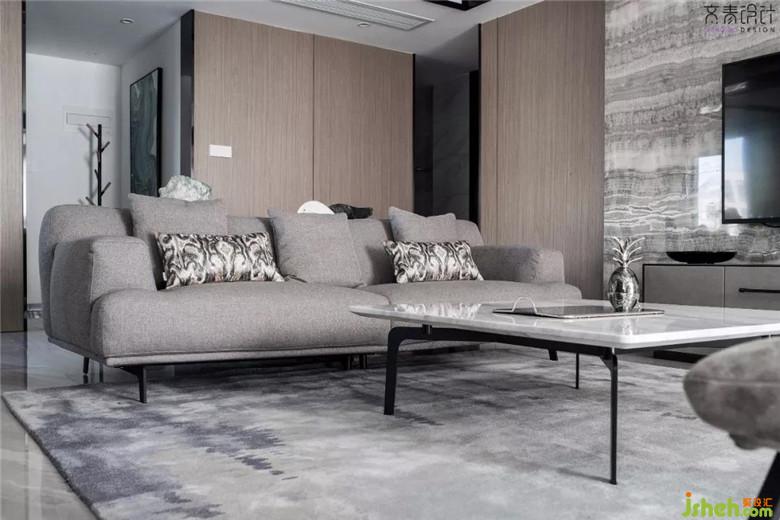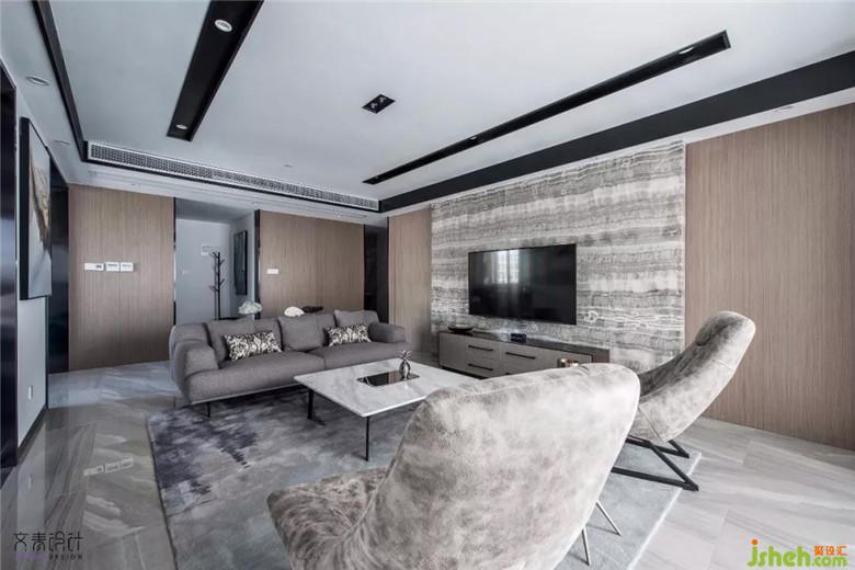 光潔的地面瓷磚與黑色的拉絲不銹鋼墻面,斑駁的反射著客廳的光線,兩廳線條感交相輝映。