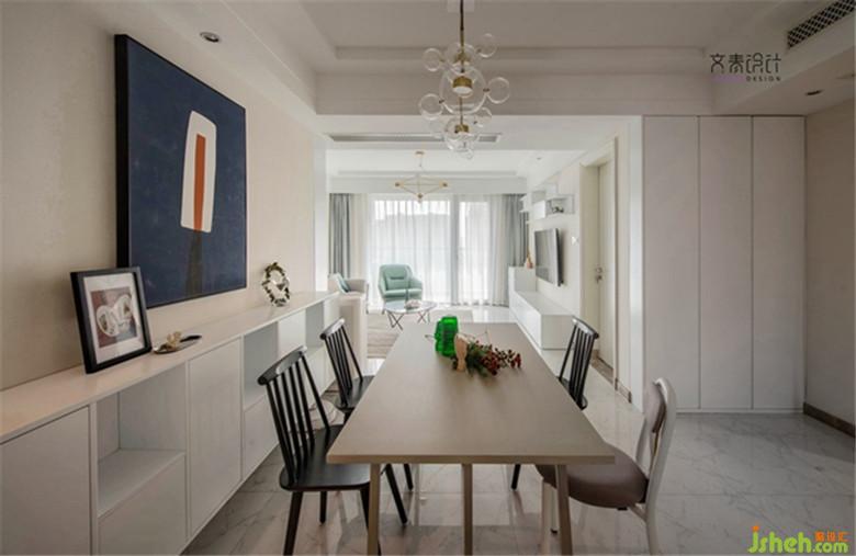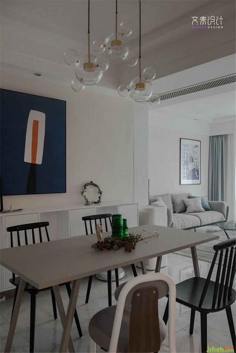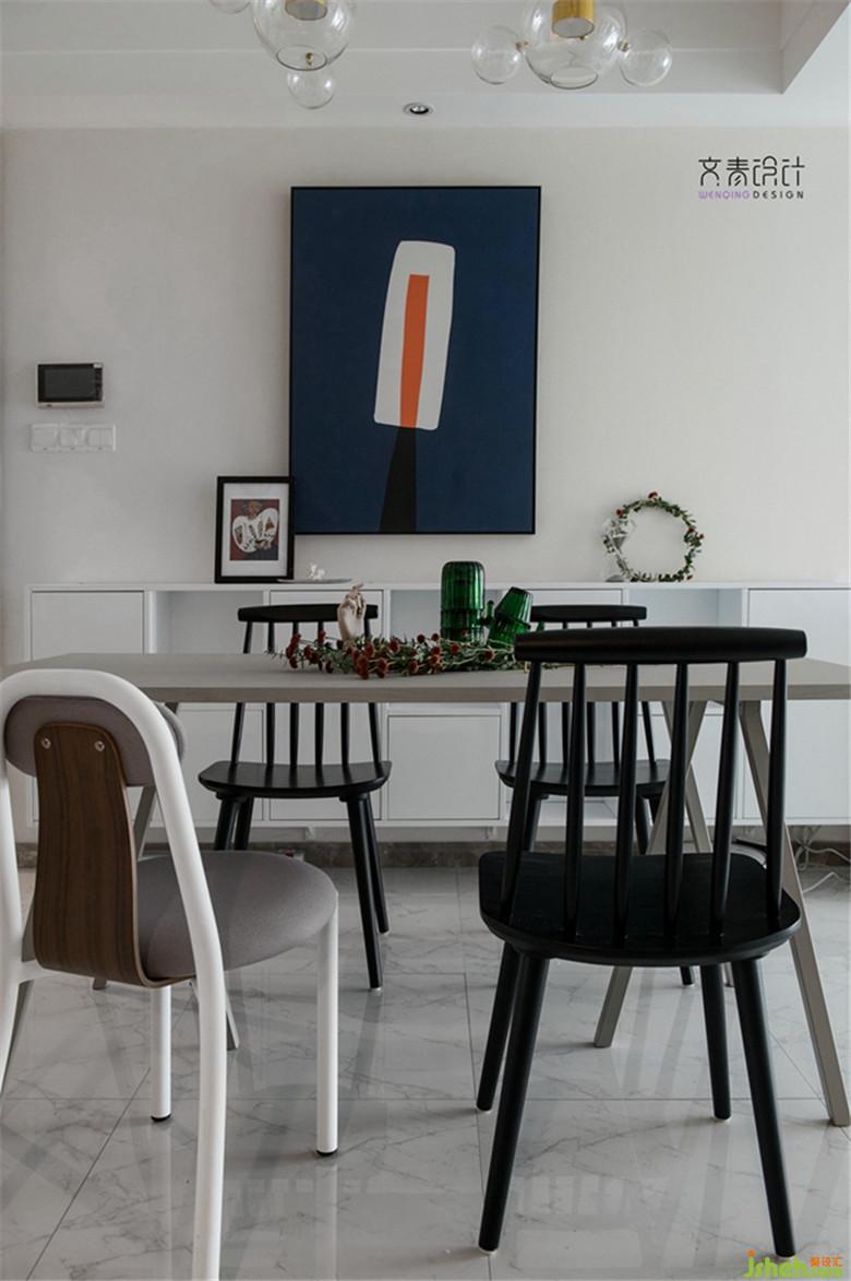 由于硬裝上沒有做改動(dòng),因此在家具、窗簾盒裝飾畫的選擇上,加入多色系的元素。顏色選擇上多用莫蘭蒂色調(diào),整體的飽和度還是偏低的,這樣整體感覺會(huì)更融洽。