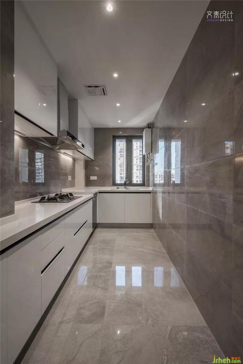 廚房鋪滿仿大理石的亮面瓷磚,柜面臺(tái)面都以白色為主,整體看去干凈通透,空間上看去也更加空闊。