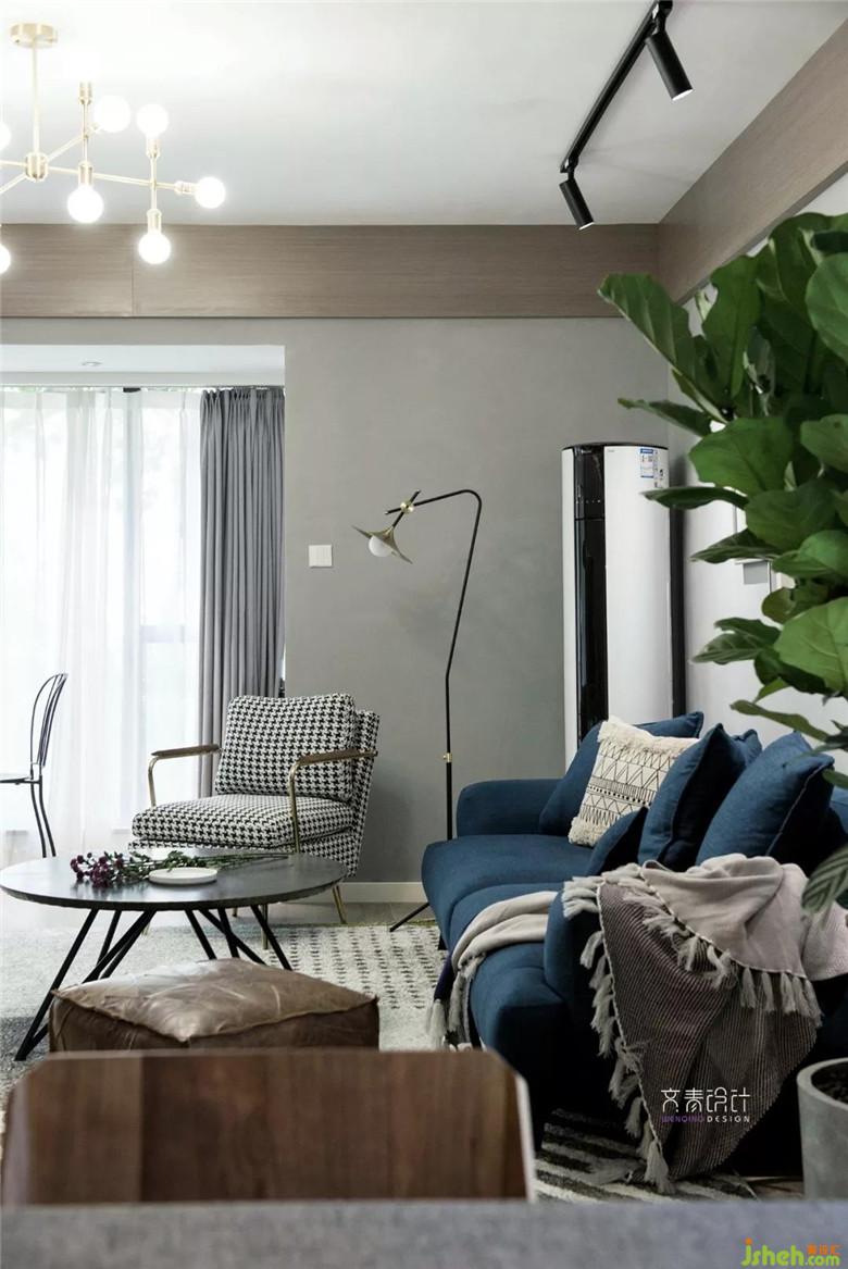 主沙發(fā)的藍跳出低飽和的框架,幾何紋路的地毯、蓋毯、抱枕與千鳥格單人沙發(fā)相呼應,不跳脫也帶小資的情調。