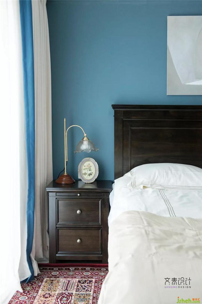 床和床頭柜的組合,皆是線條硬朗,色彩穩(wěn)重復古的造型。清早起床,是北美鄉(xiāng)村的精致感。