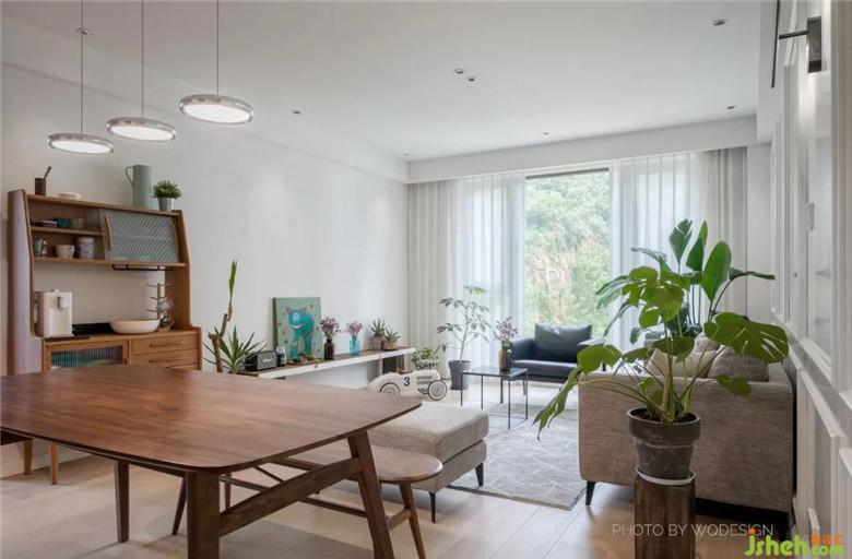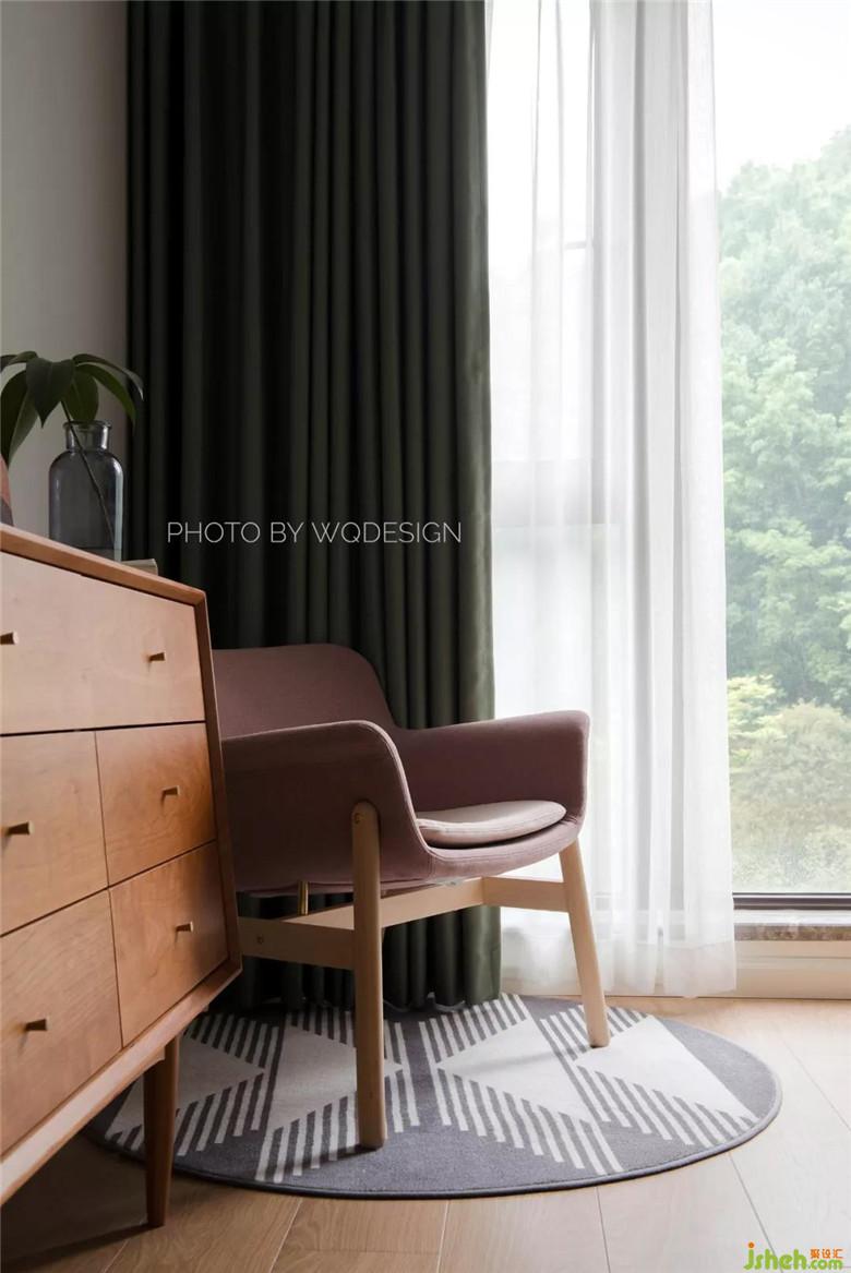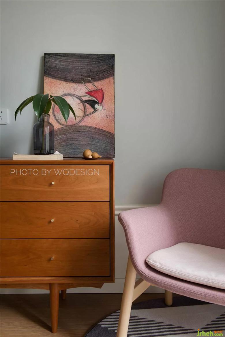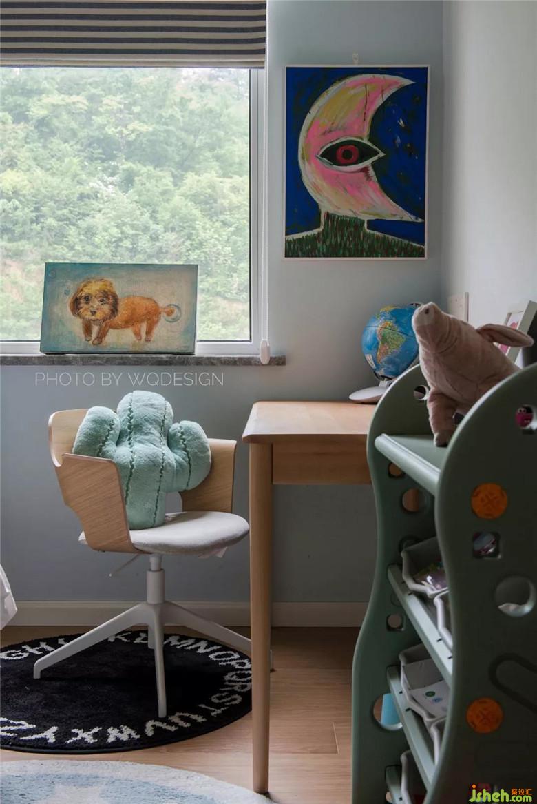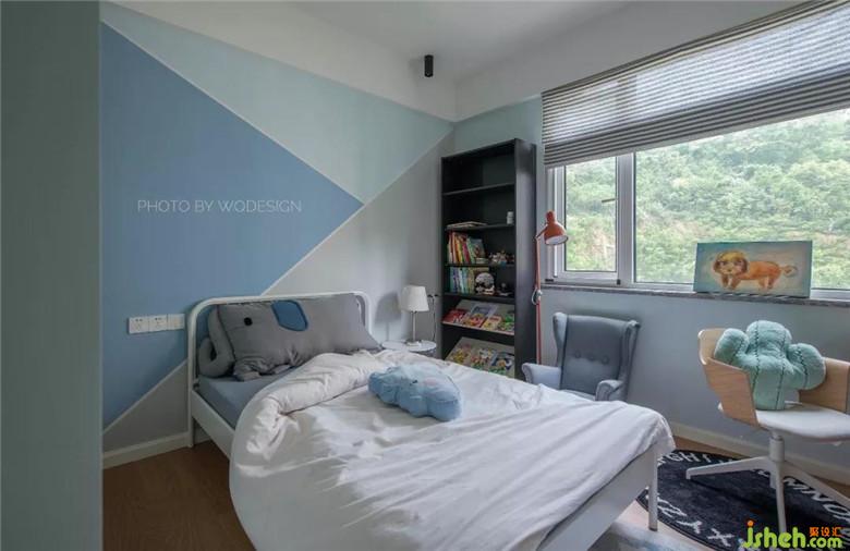 幾何色塊墻面,海藍(lán)、天藍(lán)、灰三種微冷的色調(diào)組合碰撞,糅合成一個(gè)靜謐的空間。