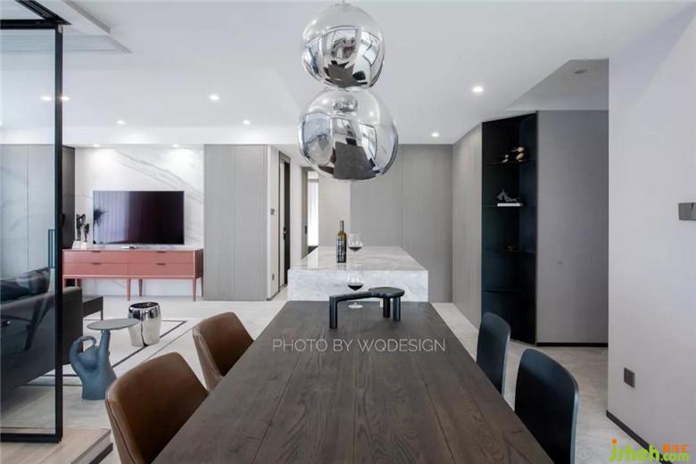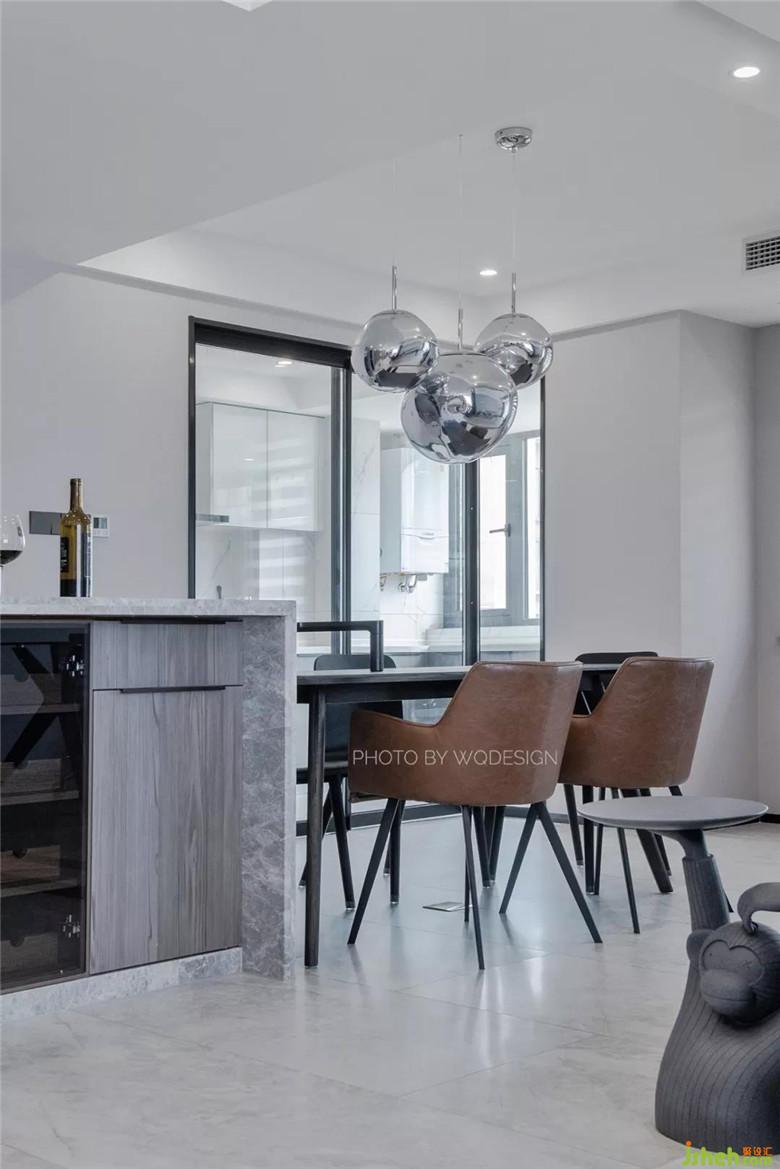 按常規(guī)設計來說,中導一般設計在廚房附近。這里將中導做在入戶門口其實另有深意。女業(yè)主不喜歡一進家門就一眼望盡空曠的客廳,這樣令她沒有安全感。也不喜做一個能阻擋全部視野的入戶門廳。而且這個中導里是一個容量較大的酒柜,使用起來十分方便。