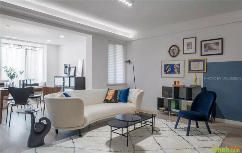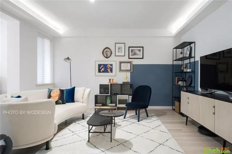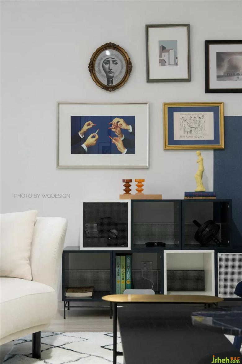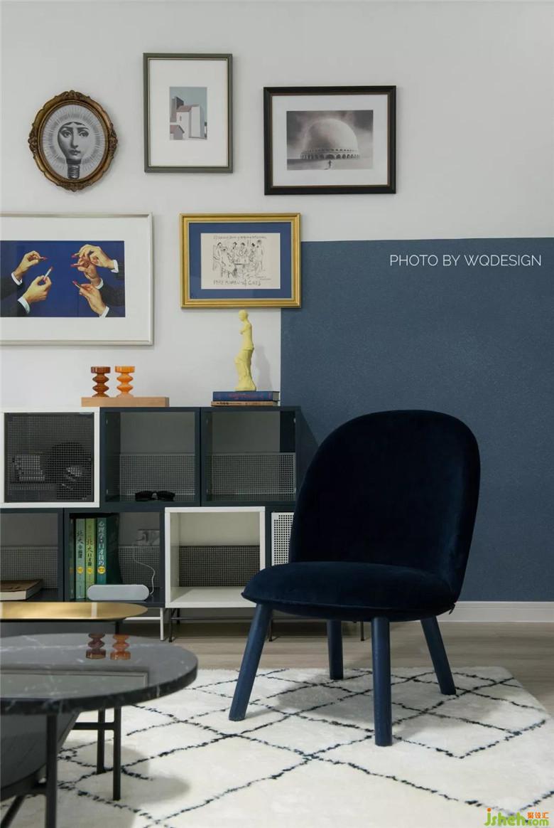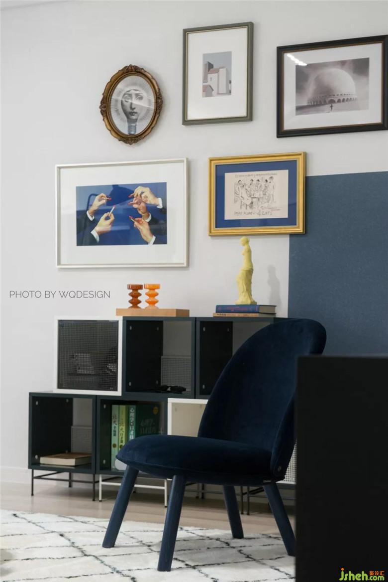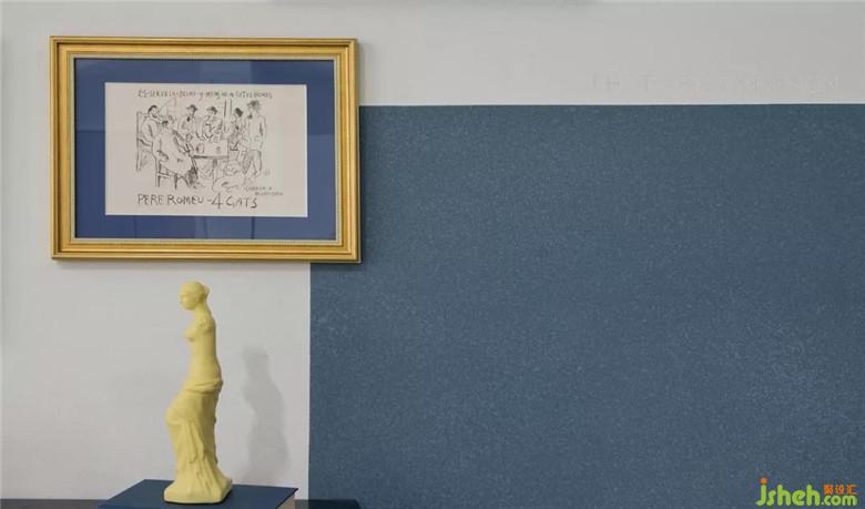 硅藻泥海藍(lán)半墻,裝飾畫撞色塊的配搭,給予各個(gè)角度不同的美感。同時(shí),也避免江邊房會潮濕潤墻的尷尬。
