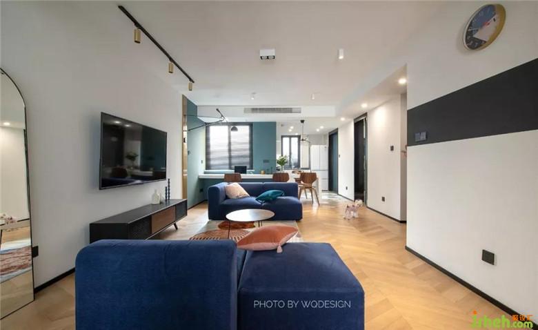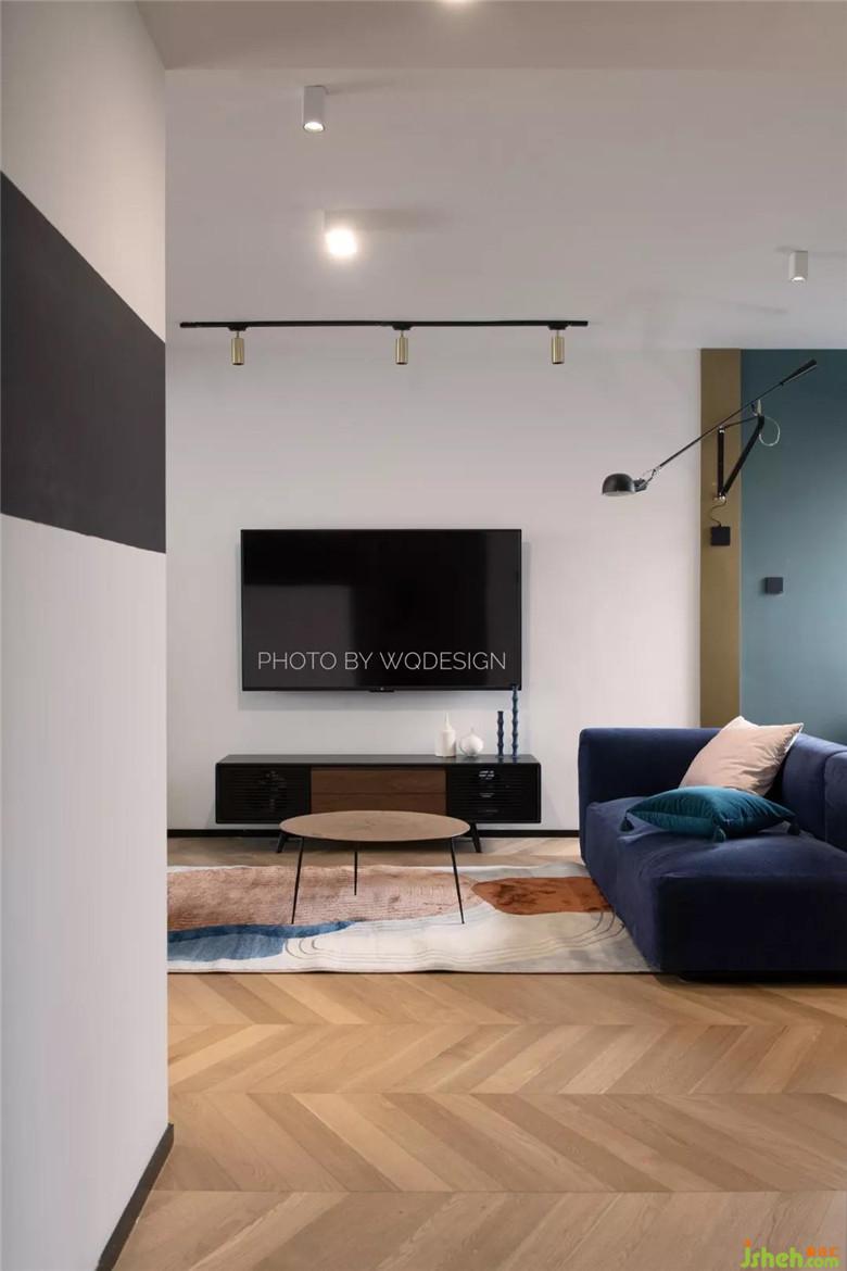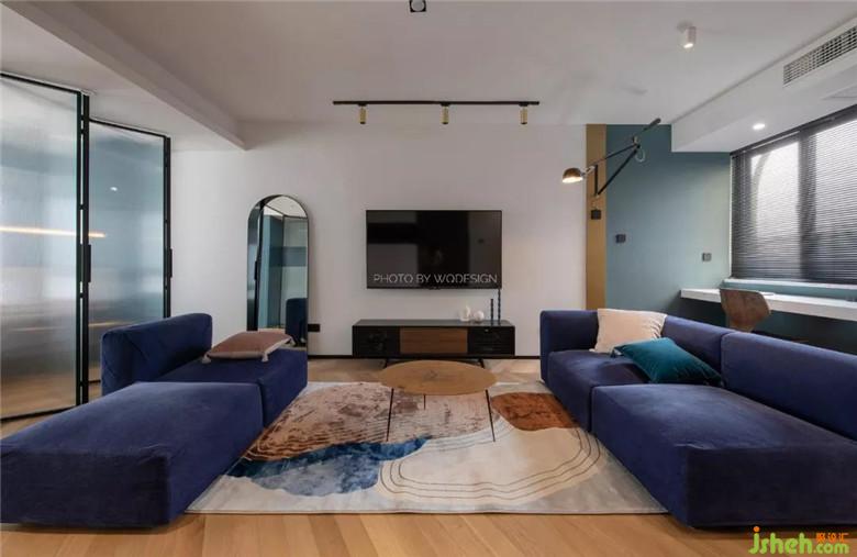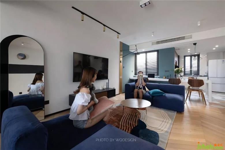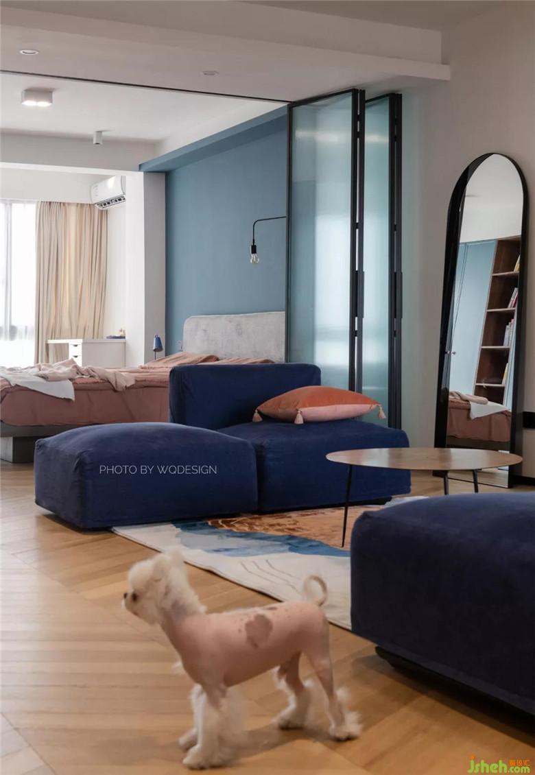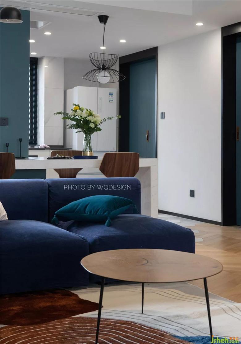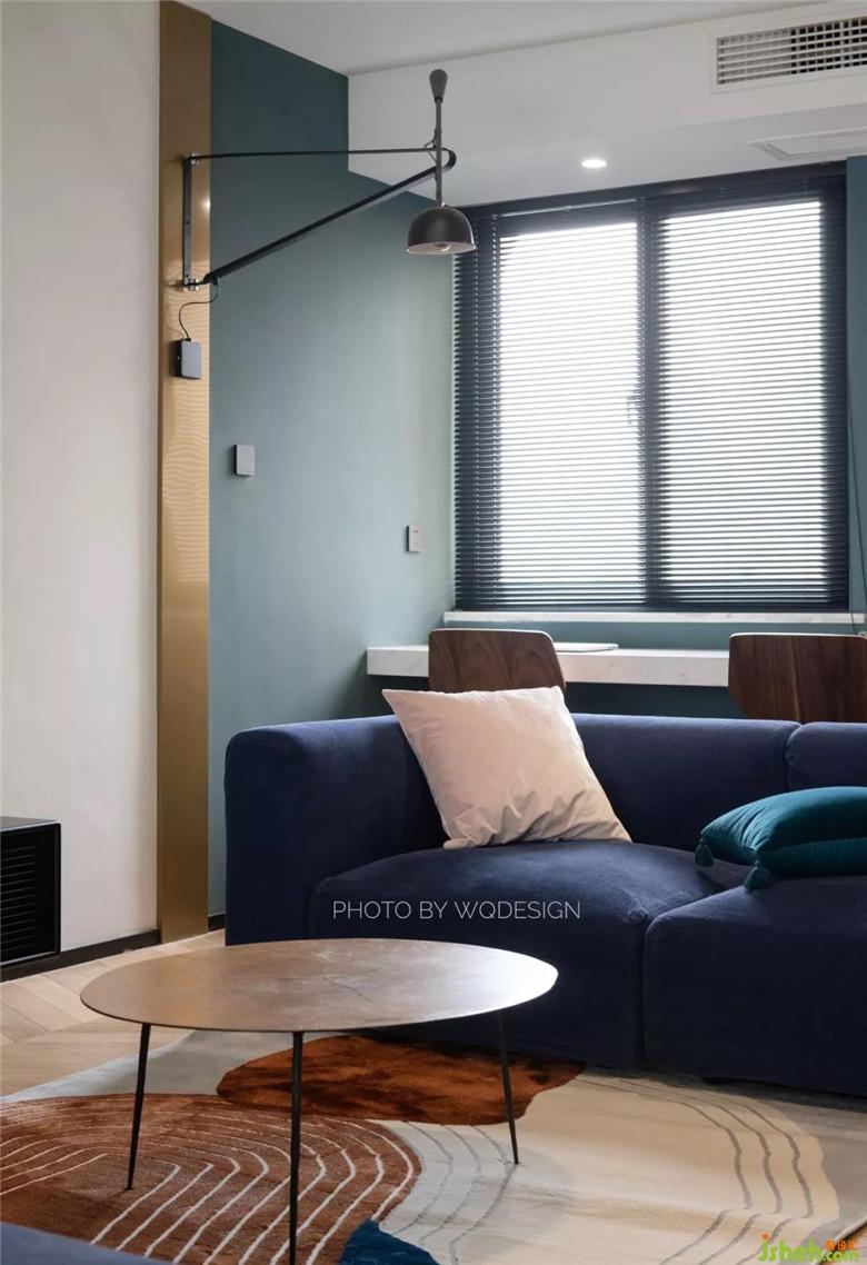整屋的各處空間都用不同的色塊劃分,主臥的海藍,工作區(qū)的湖藍以及各個家具單品都有選擇地去用藍色系點綴。此處還用銅質(zhì)收邊條壓在客廳和工作區(qū)之間,點綴出輕奢感。