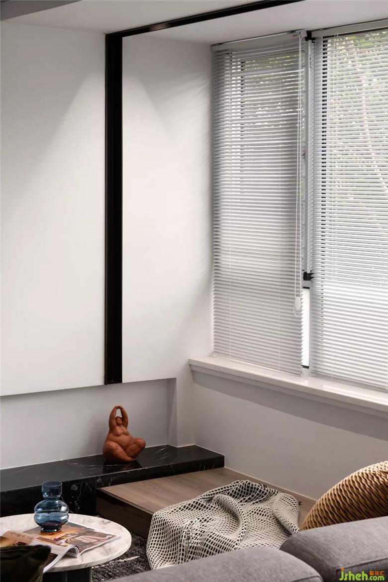 沒有設(shè)計師會舍棄這么一長條的飄窗。位于一樓的小區(qū)邊套,戶外景觀是讓人得意的地方。百葉簾斜上的空隙給予空間一定的隱私性,同時仰頭即能看到翠綠。裝修公司