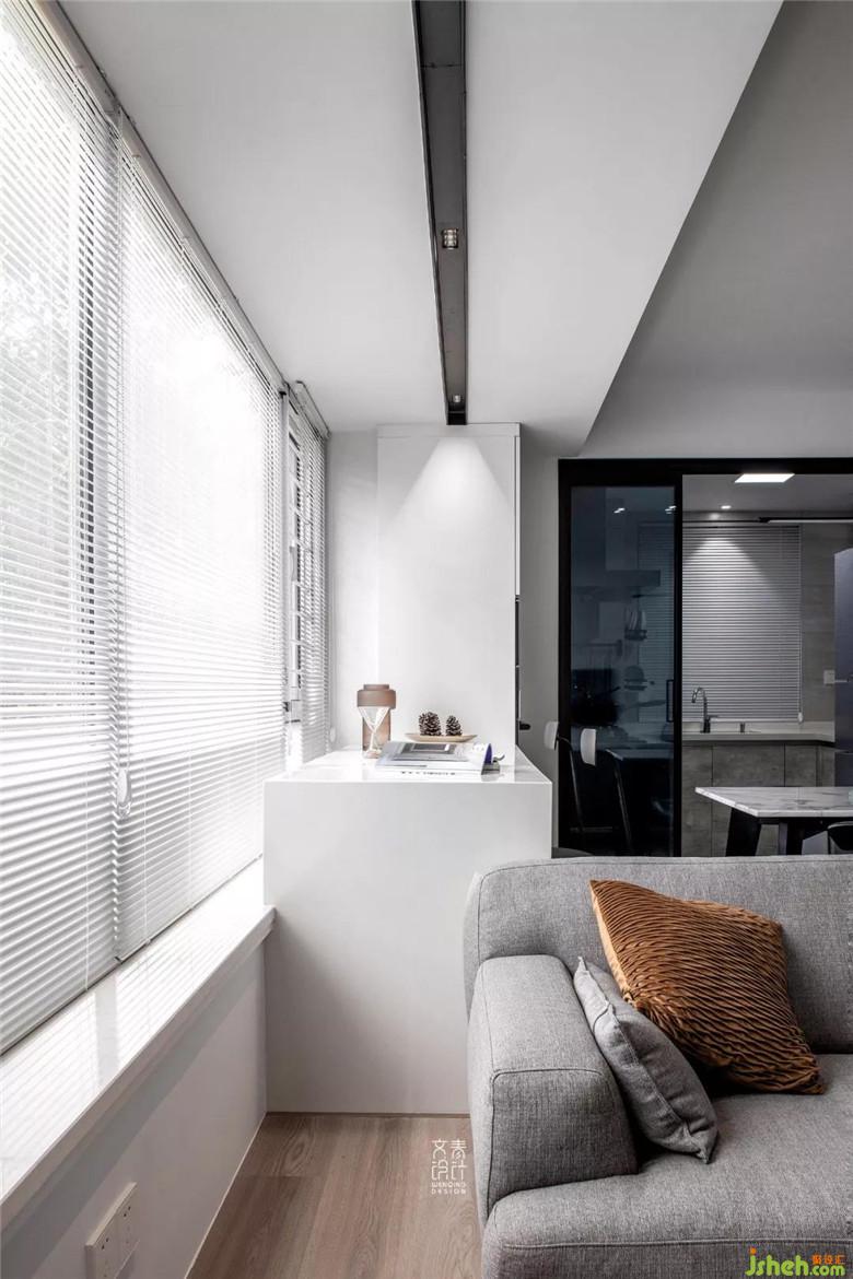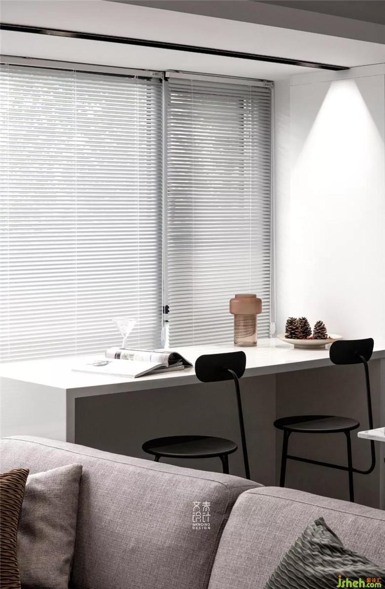 位于餐廳邊的定制書桌,很好地詮釋了功能性。朝南,用百葉簾來控制進光,適合晨起閱讀。下廚、準(zhǔn)備就餐時,也能當(dāng)做導(dǎo)臺使用。