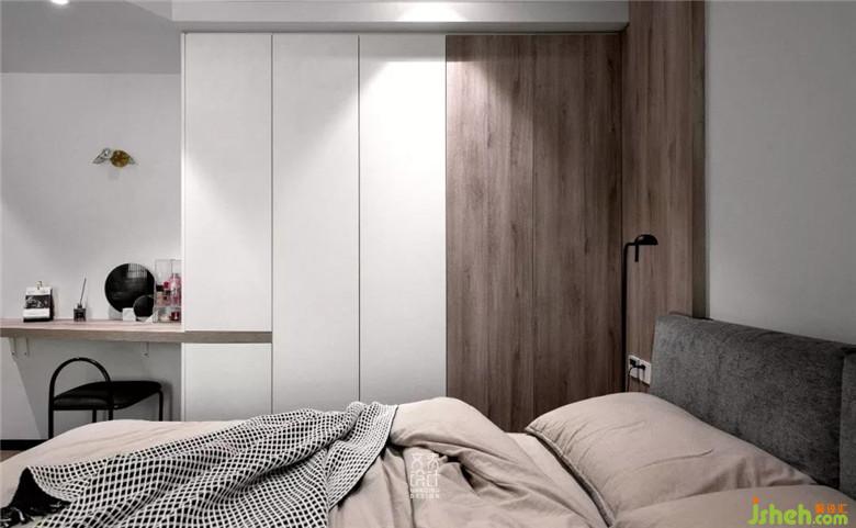 女業(yè)主習(xí)慣在臥室化妝,在主臥有限的空間里,再騰出一個桌位比較困難,因而在主臥進(jìn)門處定制出一個斜桌用作梳妝臺,其插入衣柜的設(shè)計也稍顯新意。