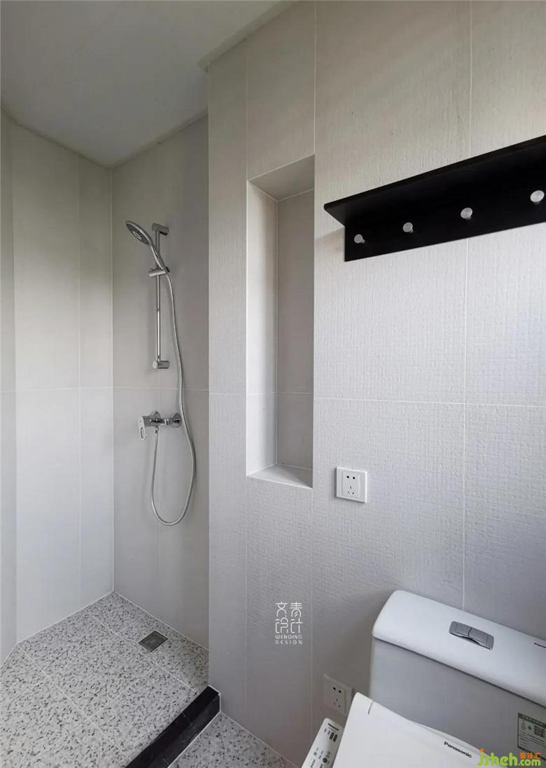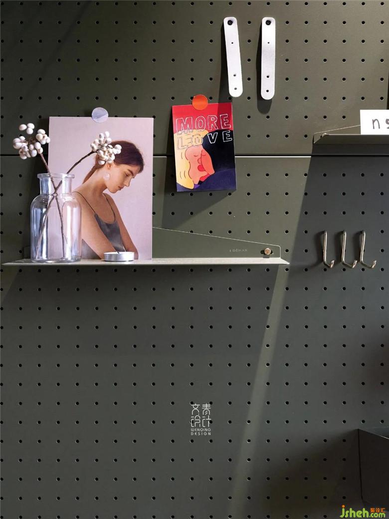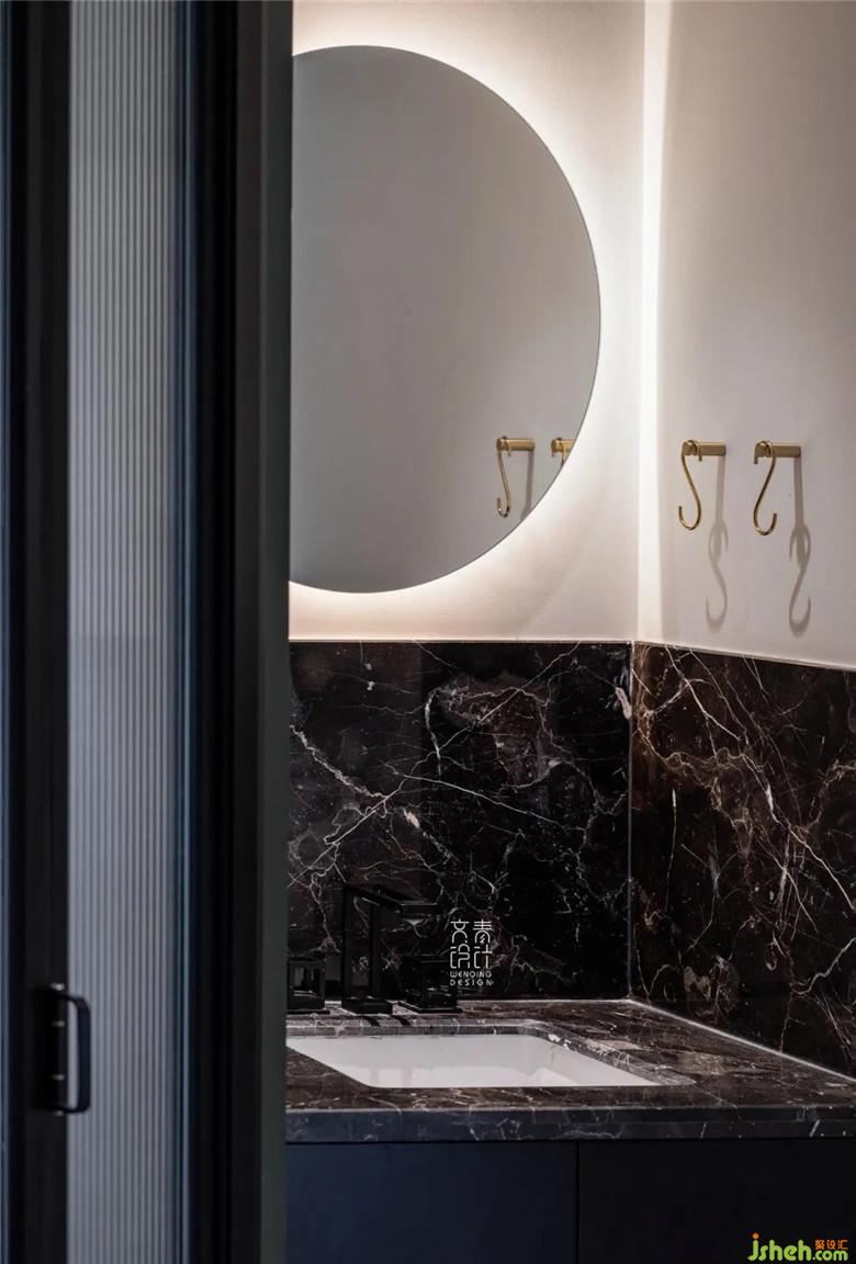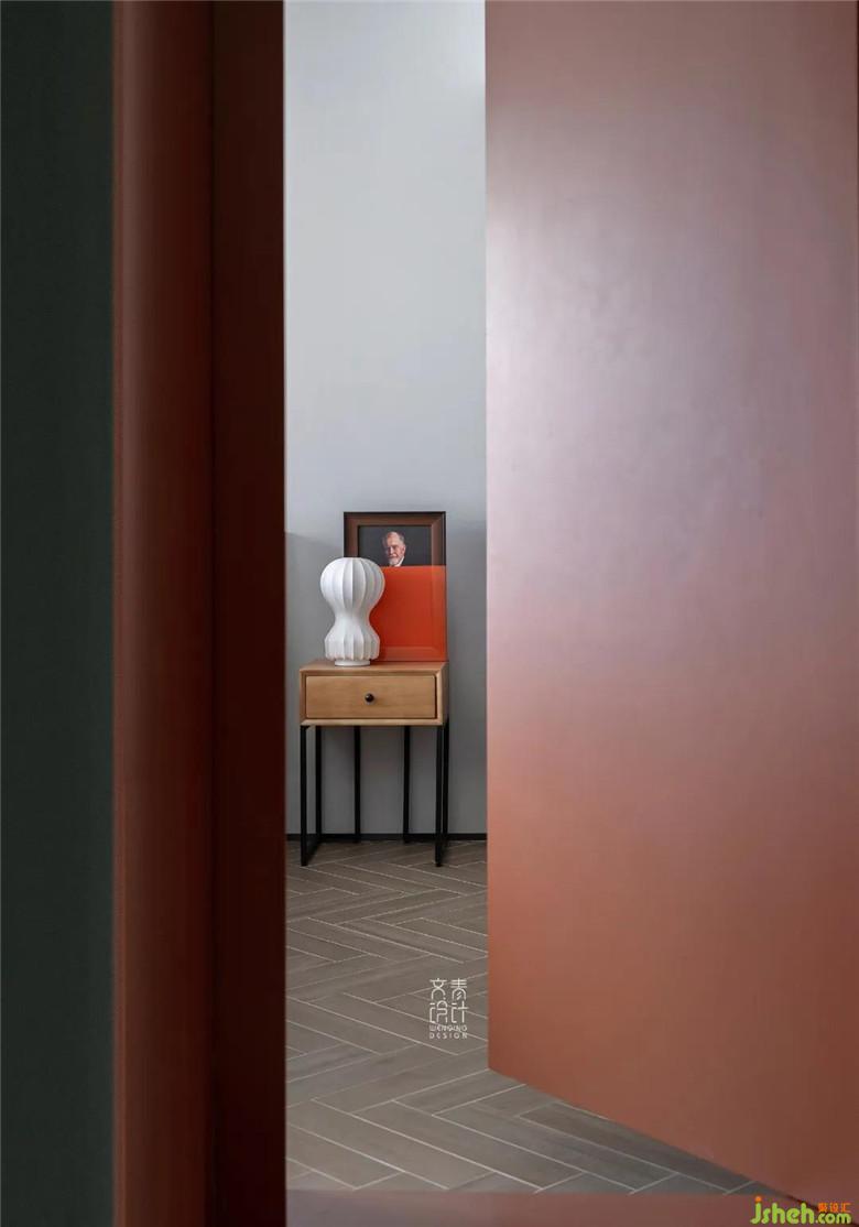 在滿墻的墨綠中有一點(diǎn)作為點(diǎn)綴的橘紅,這就是通往臥室的“暗道”,臥室不單單是休息的場(chǎng)所,而是一個(gè)私密的小空間,所以一個(gè)功能齊全的內(nèi)衛(wèi)是必不可少的。