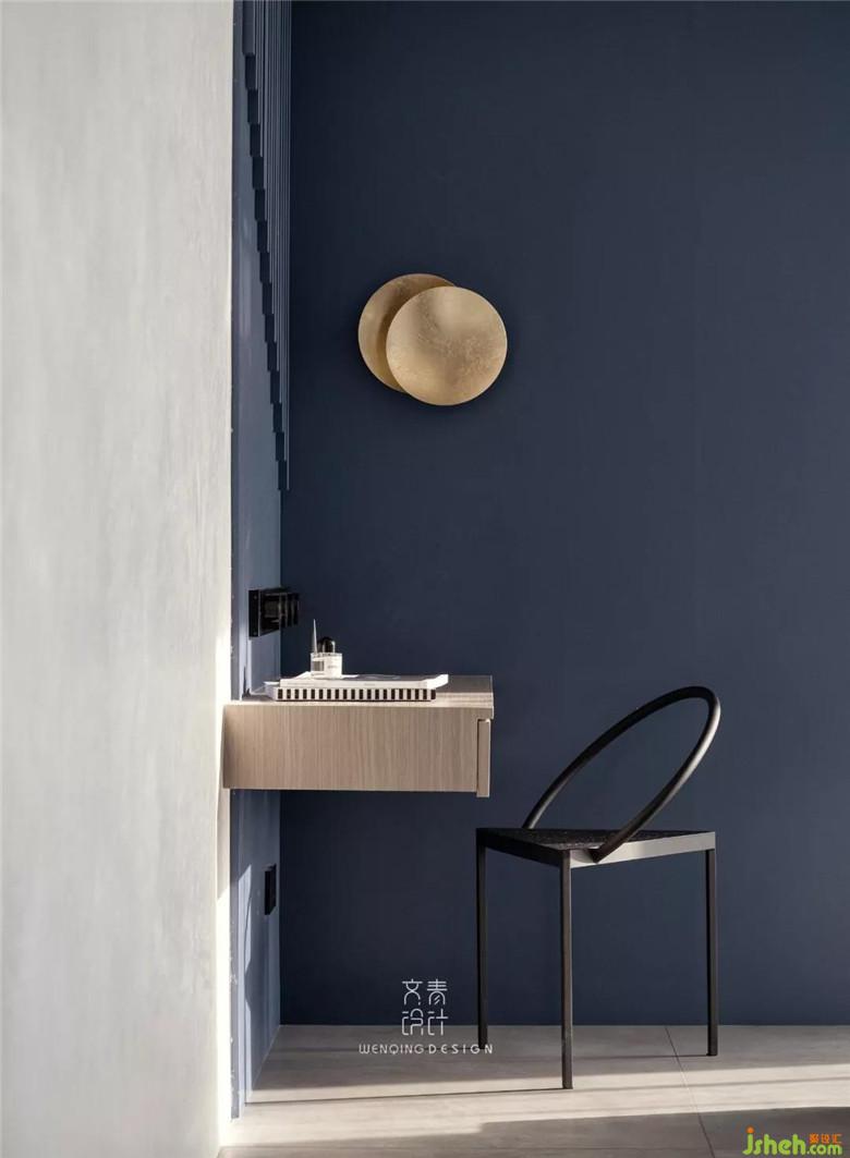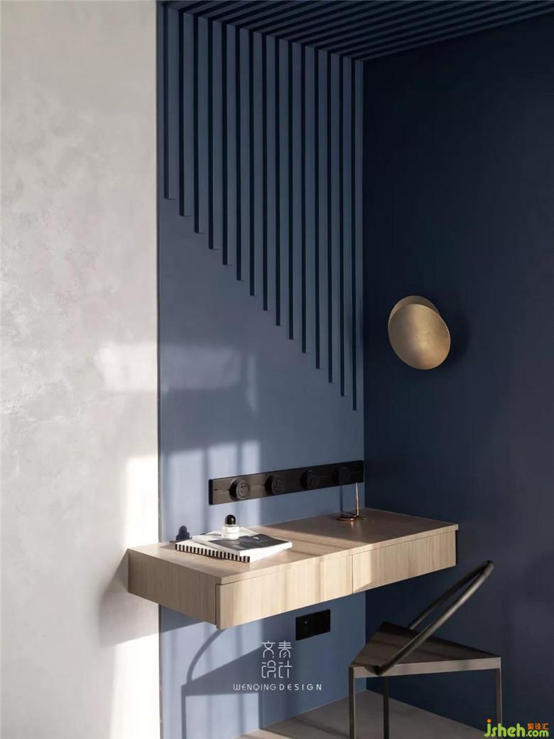 與公共區(qū)域不同的,主臥作為休憩的地方,色彩和材質都溫和許多。房內唯一的顏色就是海藍,這樣的色彩給予人以靜謐和曠達的心情。