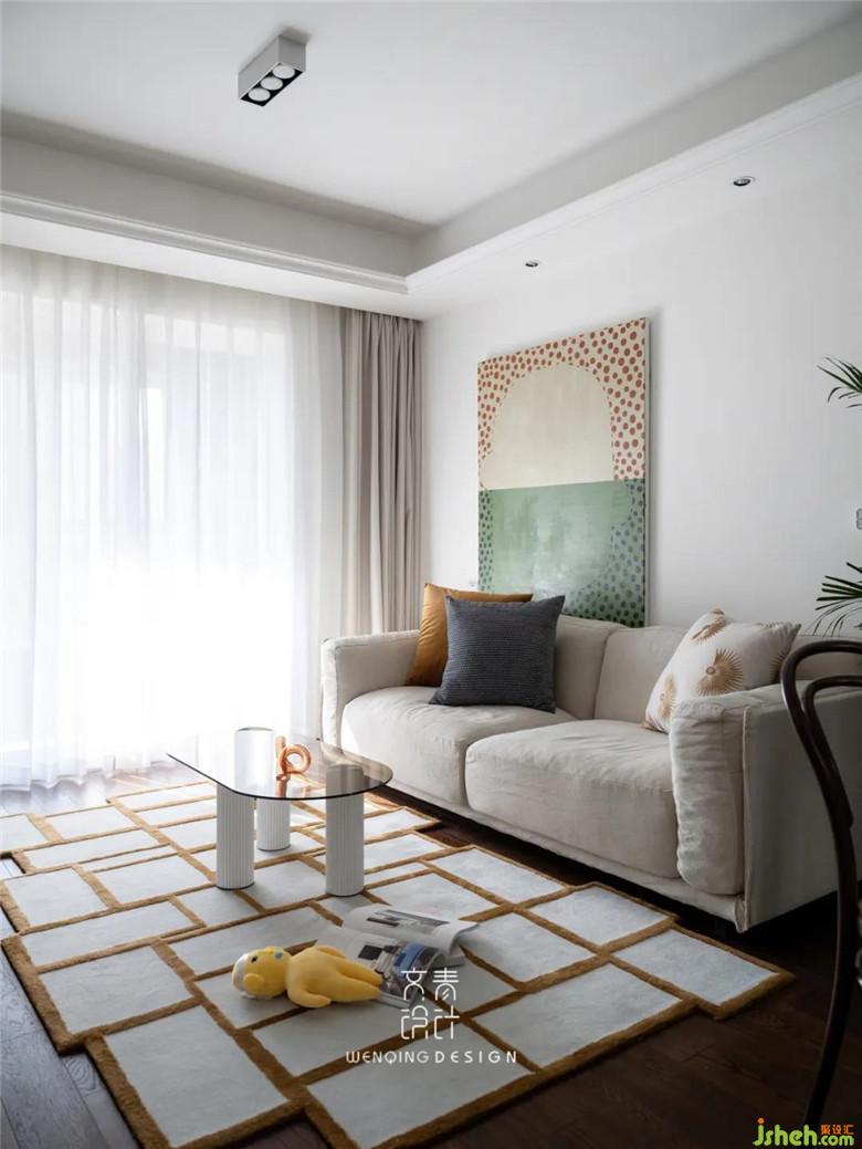 客廳原本就是簡(jiǎn)單的大白墻,裝修公司將客廳整體墻面做了暖白色的乳膠漆,讓空間更加明亮溫暖。地毯也擺脫了中規(guī)中矩的造型,幾何圖案的拼接,也讓地毯更具延伸感。