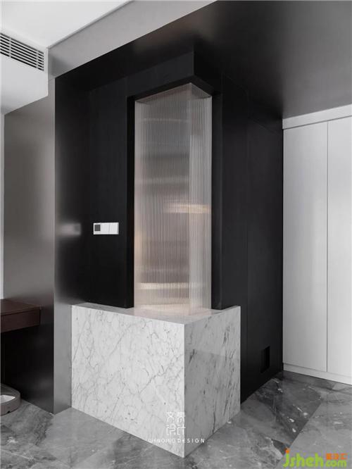 書房旁的公衛(wèi)采用不銹鋼吊頂,獨(dú)樹一幟的設(shè)計(jì),往往能讓人眼前一亮,不銹鋼材質(zhì)從頂延伸至墻面,與木飾面、玻璃和大理石形成材質(zhì)反差,讓視覺直觀體驗(yàn)到設(shè)計(jì)的碰撞感。