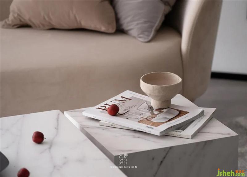 舒適坐感的絨布,保證最舒服最放松的居住體驗(yàn),搭配大理石質(zhì)感的茶幾,杭州裝修設(shè)計(jì)一柔一剛的碰撞,反而豐富了空間層次感。
