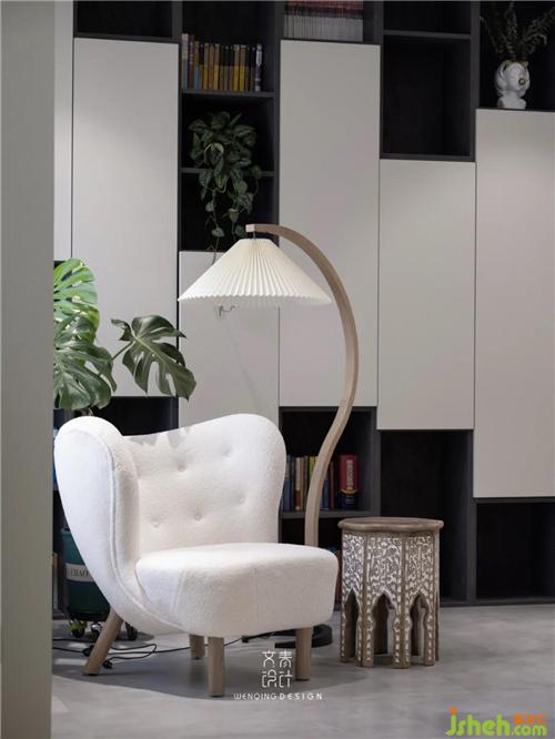 書房一角采用半開放式書柜,享受美食的同時(shí),也不能忘了精神食糧。