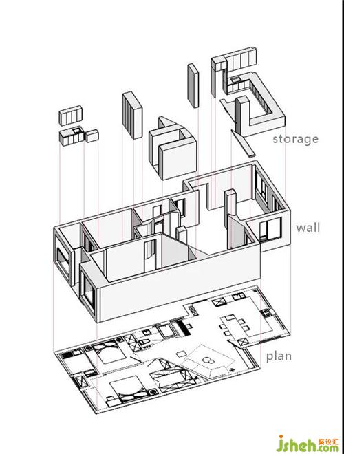 2. 將原本主臥衛(wèi)生間墻體拆除,重新砌斜墻,擴(kuò)大客廳使用空間。