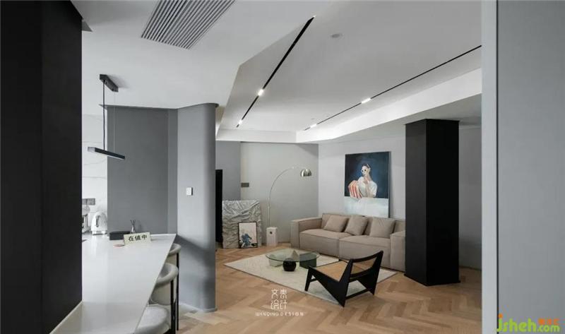 全開放式空間看久了會沒有視覺焦點(diǎn),這時(shí)不能拆除的承重柱起了作用,通過空間中梁的強(qiáng)調(diào),來表達(dá)一種空間氣質(zhì),同時(shí)在梁與吊頂接口處拉槽燈帶的方式,使得梁有一種空間層高延伸感。