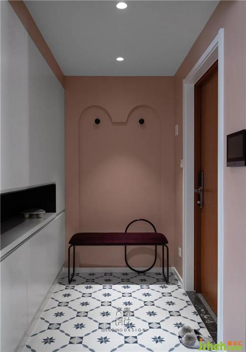 入戶玄關(guān)區(qū)域鋪就復(fù)古小花磚,形成單獨(dú)的玄關(guān)落灰區(qū),方便日常衛(wèi)生打理,正對(duì)大門(mén)處定制內(nèi)嵌鞋柜,再多鞋子也放得下,右側(cè)特地設(shè)計(jì)動(dòng)物造型背景墻,滿足業(yè)主少女心的同時(shí),又能隨手掛一下包包和衣服,美觀與實(shí)用雙重兼顧。
